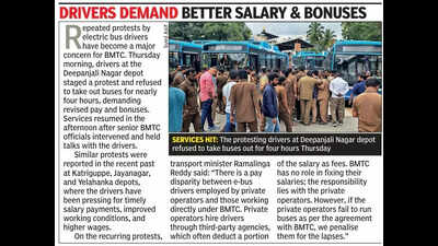 Bengaluru: Over 13,000 breakdowns involving electric buses have been reported in the last two and a half years, posing a major challenge for BMTC in its efforts to promote green mobility and sustainable public transport.Since Dec 2021, BMTC has introduced nearly 1,700 electric buses through private operators, accounting for around 25% of the corporation’s total bus fleet. The initiative has, however, been hampered by frequent breakdowns, accidents, and complaints of rash driving.Transport minister Ramalinga Reddy said, “Over the past two and a half years, more than 13,000 electric bus breakdowns have been reported, which remains a major concern. Battery-related issues, in particular, take longer to resolve, disrupting traffic flow on the roads.”A senior police officer said that in Sept alone, 281 bus breakdowns were reported, with the majority involving electric buses. “When an electric bus breaks down on main roads, it is not as easy to move it aside as a diesel bus,” the officer said. “To address this, BMTC has deployed wreckers dedicated to towing electric buses. Four such wreckers have been stationed at strategic locations. A system has been put in place to contact depot managers for quick response for removal of the vehicle when it breaks down,” the official said.The officer also raised concerns over drivers employed by private operators. “Unlike those directly employed by BMTC, many drivers hired through private contractors lack the necessary skills in road safety and professional conduct. There have been numerous instances of drivers abandoning buses over minor issues. Regular BMTC employees fear disciplinary action, but drivers employed by private operators often do not show the same level of responsibility— if they lose a job, they can simply seek another the next day,” the officer added.Recently, after an electric bus broke down on Outer Ring Road, the traffic jam stretched for several kilometres, testing the patience of motorists travelling towards Marathahalli, Kadubeesanahalli, Bellandur, and other areas.The minister said that such challenges are not unique to Bengaluru, as other cities operating electric buses through private contractors face similar issues.“As per the central govt’s policy, subsidies are provided directly to private operators for the supply, operation and maintenance of these buses. BMTC pays operational costs to the private operators on a per-kilometre basis. Private operators have to employ drivers and maintain the vehicles. We only provide conductors for issuing tickets for the passengers.” The minister said that apart from frequent breakdowns, incidents of rash driving and recurring accidents involving electric buses remain a concern.Compounding the problem, repeated protests by electric bus drivers have disrupted city bus services last week. The drivers employed by private contractors have been demanding better pay, bonuses, and insurance coverage. BMTC officials, however, maintain that the corporation has no say in the salary of e-bus drivers and service conditions, as these drivers are not directly on its payroll.—-Drivers protest at Deepanjali Nagar depotRepeated protests by electric bus drivers have become a major concern for BMTC. Thursday morning, drivers at the Deepanjali Nagar depot staged a protest and refused to take out buses for nearly four hours, demanding better pay and bonuses. Services resumed in the afternoon after senior BMTC officials intervened and held talks with the drivers.Similar protests were reported in the recent past at Katriguppe, Jayanagar, and Yelahanka depots, where drivers have been pressing for timely salary payments, improved working conditions, and higher wages.On the recurring protests, transport minister Ramalinga Reddy said, “There is a pay disparity between e-bus drivers employed by private operators and those working directly under BMTC. Private operators hire drivers through third-party agencies, which often deduct a portion of the salary as fees. BMTC has no role in fixing their salaries; the responsibility lies with the private operators. However, if the private operators fail to run buses as per the agreement with BMTC, we penalise them for the lapses.“