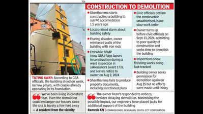 Bengaluru: A five-storey structure raised illegally on 15×50 ft (750sqft) site — which is an advertisement for multiple building law violations, and slapped with a stop-work order — tilted dangerously to its right side on Friday, sending a wave of panic in the area packed with tightly-built residential structures in Venkatapura, Koramangala I Block.Only two-storey structures are allowed in this area, which has a 20ft-wide road. The bright-yellow building is surrounded by residential blocks on all sides.The structure, according to BBMP officials, stood on weak, narrow pillars, with cracks already appearing in its foundation. Locals said the building — ready for inauguration and set to be converted into a PG accommodation — looked ready to collapse any day.Fearing disaster, the owner reinforced the walls of the building with iron rods, a temporary measure that eventually underscored its fragility.The erstwhile BBMP (now Great Bengaluru Authority, GBA) first flagged the lapses in construction during a ward inspection in Jakkasandra (Ward 173). Subsequently, a notice was issued to the owner on Aug 2, 2024, under Section 313 of BBMP Act, 2020. However, when the owner Shanthamma, wife of Lakshman, failed to furnish valid documents, including the sanctioned plans, the civic officials declared the construction unauthorised, besides issuing a stop-work order under multiple provisions of the same Act.Worse, the owner continued with the construction by taking up carpentry, plumbing, and electrical works at the building. The owner turned up before the civic officials on Sept 13, 2024, admitting to poor quality of construction and sought time to demolish the building under an architect’s supervision, citing the risk of damaging adjoining houses. In response to the owner’s request, BBMP deferred action. However, subsequent inspections showed no demolition efforts; instead, finishing works were being fast-tracked.Admitting to cracks in the foundation, the owner sought permission on Aug 25 to demolish the building. Yet, there were no efforts made until Friday. The assistant executive engineer of Koramangala sub-division, GBA South, authorised immediate demolition under strict safety measures.Gripped by fear, a resident from the vicinity told TOI, “We’ve been living in constant fear. Even the demolition could endanger our houses since the site is barely a few feet away.” Police from Madiwala station and a backhoe are at the spot as the owner was said to be making arrangements to bring down the building. Demolition, which started by Friday afternoon, is expected to be completed by Monday.Ramesh KN, commissioner, Bengaluru South City corporation, said the owner hasn’t responded to notices, besides delaying demolition. “Minimising the possible impact, our engineers have placed jacks for additional support of the building,” he added.