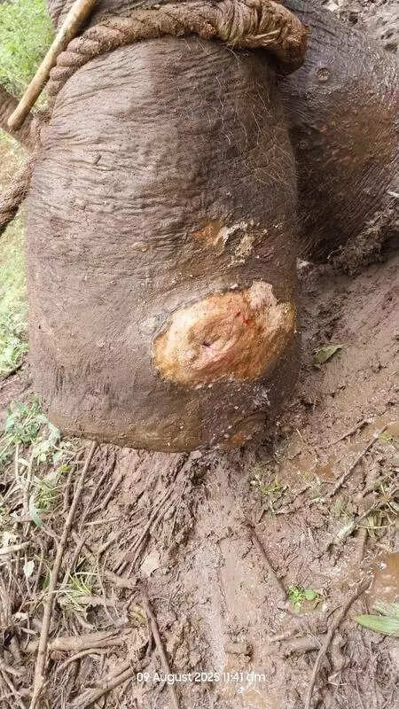 Shivamogga: Wildlife activists have expressed concern over the injuries sustained by Vikrant, an elephant housed at Sakrebailu elephant camp in Shivamogga. The tusker from Sakleshpura, was captured after a two-day long operation, in March, and was housed at the elephant camp on the banks of Tunga River near Shivamogga city. The elephant has now sustained injuries, which the wildlife activists claim point to the ill-treatment it is subjected to. Videos and photos of the elephant’s wounds have gone viral, sparking outrage and calls for better care and management of the animals.Vikrant, who is believed to be around 30 to 35 years old, was confined within a kraal of wooden logs at Sakrebailu, where he developed injuries on his right thigh and leg. Conditions at the camp have raised serious questions about the welfare of the elephants.It is alleged that delayed treatment may have led to fibrosis, which has now reopened and is discharging pus. Environmentalists claim that the use harsh of methods like ‘barji’ piercing is concerning, and that positive reinforcement techniques would be more humane and effective. They contend that the authorities are not paying adequate attention to the animals’ condition.Monsoon further complicates the healing process, as the elephant applies mud to the wound, prolonging recovery time. Speaking to TOI, a wildlife activist, who requested anonymity, said that Vikrant is lacking proper medication at the camp. The camp’s history of elephant deaths is alarming, with over 20 elephants losing their lives within ten years.Speaking to TOI, DCF (wildlife) Prasanna Krishna Patgar said “An old wound has now opened, leading to the formation of pus. Since it is the rainy season and the elephant applies mud on the wound, it takes more time to heal.” The DCF also asserted that there is no lack in treatment.