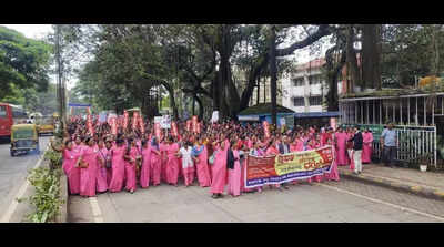 Pic: ASHA workers walk towards Channamma Circle on ThursdayBelagavi: Thousands of ASHA workers, who were staging a protest in the premises of the Belagavi deputy commissioner’s office day and night for the past three days, ended their protest on Thursday. Earlier in the day, they created a human chain at Channamma Circle.Thousands of ASHA workers, who were staging 24X7 sit-ins demanding the fulfilment of various demands, including the provision of Rs 10,000 as an honorarium, took to the streets on the third day on Thursday, to protest against the govt. The ASHA workers, who walked from the DC’s office, formed a human chain at Channamma Circle and blocked the road to express their anger against the govt. Later, they went to the zilla panchayat office and the deputy commissioner’s office and submitted a memorandum to the govt.The protest was led by the District Association of ASHA workers in collaboration with the All India United Trade Union Congress (AIUTUC).The protesters demanded that the work of evaluating the education department should not be entrusted to ASHA workers and that they should be given an honorarium of Rs 10,000 as promised. They sought that various demands, including not dismissing ASHA workers, should be fulfilled. They raised slogans.An ASHA worker said that they work day and night, whether it is the rainy season or summer season. Chief minister Siddaramaiah promised to give them a minimum honorarium of Rs 10,000 but did not take any action after that. Advocate Raju Ganagi said that numerous ASHA workers flooded Channamma Circle. Despite their holding a three-day protest, no govt representative or minister visited them. This govt is not qualified to give at least Rs 10,000 to ASHA workers as an honorarium.Laxman Jadagannavar, district president of AIUTUC, said that a three-day night dharna has been held in 31 districts of the state. “During a meeting held in January, the CM announced a guarantee that 10 thousand would be given every month from April. Even after 7-8 months, it has not been implemented. We have been holding a day-night dharna for the last three days for the implementation of the order. We have made three main demands. Officials visited the dharna site in Bengaluru and wrote in writing that the ASHA workers will not be removed from their work. But there is no information about giving 10 thousand rupees honorarium. The order should be implemented immediately. Otherwise, a fierce struggle will be held in the coming days. We are ready to go to jail, he said.The office bearers of the ASHA workers association, Geeta Rayavvagol, Reeta Fernandes, Jayashree Navi, Sujata Kadmath, and Sumitra Hiremath, participated.