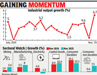 .The manufacturing sector rose by 8% in Nov, higher than 2% in Oct and above the 5.5% in Nov last year. The mining sector, which had been impacted by unseasonal rains, rebounded and rose by 5.4% in Nov, above the 1.8% contraction in Oct and higher than the 1.9% growth in Nov last year.The highlight for Nov was also the robust expansion in consumer durables and non durables sectors, which grew by 10.3% and 7.3% respectively. “On the demand front, the positive aspect was the improvement in the output of consumer durables and non-durables which grew by 10.3% and 7.3%, respectively, reversing the contraction seen in the previous months. Factors such as GST rationalisation, income tax relief, and easing inflation have boded well for the consumption scenario,” said Rajani Sinha, chief economist at ratings agency CareEdge.“On the investment front, there has been sustained healthy momentum in the growth of infrastructure/construction goods and capital goods output,” said Sinha.The capital goods sector, a key gauge of investment activity, rose an annual 10.4% higher than the 2.1% recorded last month and above the 8.9% expansion in the month of Nov last year.Aditi Nayar, chief economist at ratings agency Icra, said the impact of the US tariffs and penalties is likely to reflect across some of the manufacturing segments, partly offsetting the positive impact of the GST rate rejig. “However, electricity demand has expanded in Dec 2025 after a gap of two months, which should boost power generation in the month, auguring well for IIP growth in the month. We expect the IIP growth to ease to 3.5-5.0% in Dec, as the base effect normalises and the benefit from restocking wanes,” said Nayar.