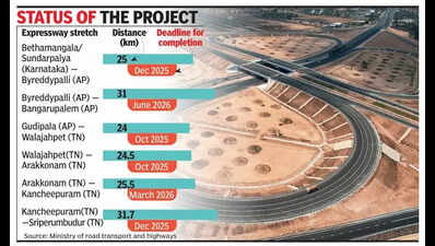 Bengaluru: The much-delayed Bengaluru-Chennai expressway, a key infrastructure project aimed at enhancing connectivity between two major south Indian cities, is now expected to be completed by July 2026.The Rs 15,188 crore-expressway, spanning three states, was expected to be finished by 2023 after its construction was launched in 2022. However, various delays have pushed its completion deadline by over three years. The latest delay was confirmed by Union minister for road transport and highways Nitin Gadkari on Thursday, in response to a query from Bengaluru central MP PC Mohan. As of now, barely 100.7km, which is less than half of the 263.4km expressway, is complete. The stretch from Sundarpalya in Karnataka to Byreddypalli in Andhra Pradesh is slated for completion by Dec this year. In Karnataka, 71.7km stretch from Bengaluru to Bethamangala and in Andhra, 29km stretch between Bangarupalem and Gudipala are complete. The 24km stretch connecting Gudipala to Walajahpet in Tamil Nadu is expected to be ready by Oct this year. However, the remaining 57.2km, linking Arakkonam to Sriperumbudur on the outskirts of Chennai, will not be completed until early 2026. The stretch in Andhra connecting Byreddypalli to Bangarupalem will be the last to get completed, extending the completion timeline to June 2026. The project delays can be attributed to problems faced by states in obtaining necessary permissions and in acquiring land. In Karnataka, the project was delayed by issues such as delayed land acquisition, oversight in valuing affected structures, and public resistance, according to the Union minister.In Tamil Nadu, the project faced problems over obtaining necessary permissions for land levelling and technical complexities involved in cutting and blasting hard rocks in various areas. Similarly, the Andhra bottleneck involves securing permissions to commence work in the 10km eco-sensitive zone of the Koudinya Wildlife Sanctuary. The expressway, once completed, is expected to significantly reduce travel distance and time between Bengaluru and Chennai, providing a high-speed corridor that will enhance economic and social connectivity between these two major cities. Expressway stretchDistance (km)Deadline for completionBethamangala/Sundarpalya (Karnataka) – Byreddypalli (A.P)25Dec 2025Byreddypalli (AP) – Bangarupalem (AP)31June 2026Gudipala (AP) – Walajahpet (TN)24Oct 2025Walajahpet(TN)-Arakkonam (TN)24.5Oct 2025Arakkonam (TN)-Kancheepuram (TN)25.5March 2026Kancheepuram(TN) -Sriperumbudur (TN)31.7Dec 2025 Source: Ministry of road transport and highways