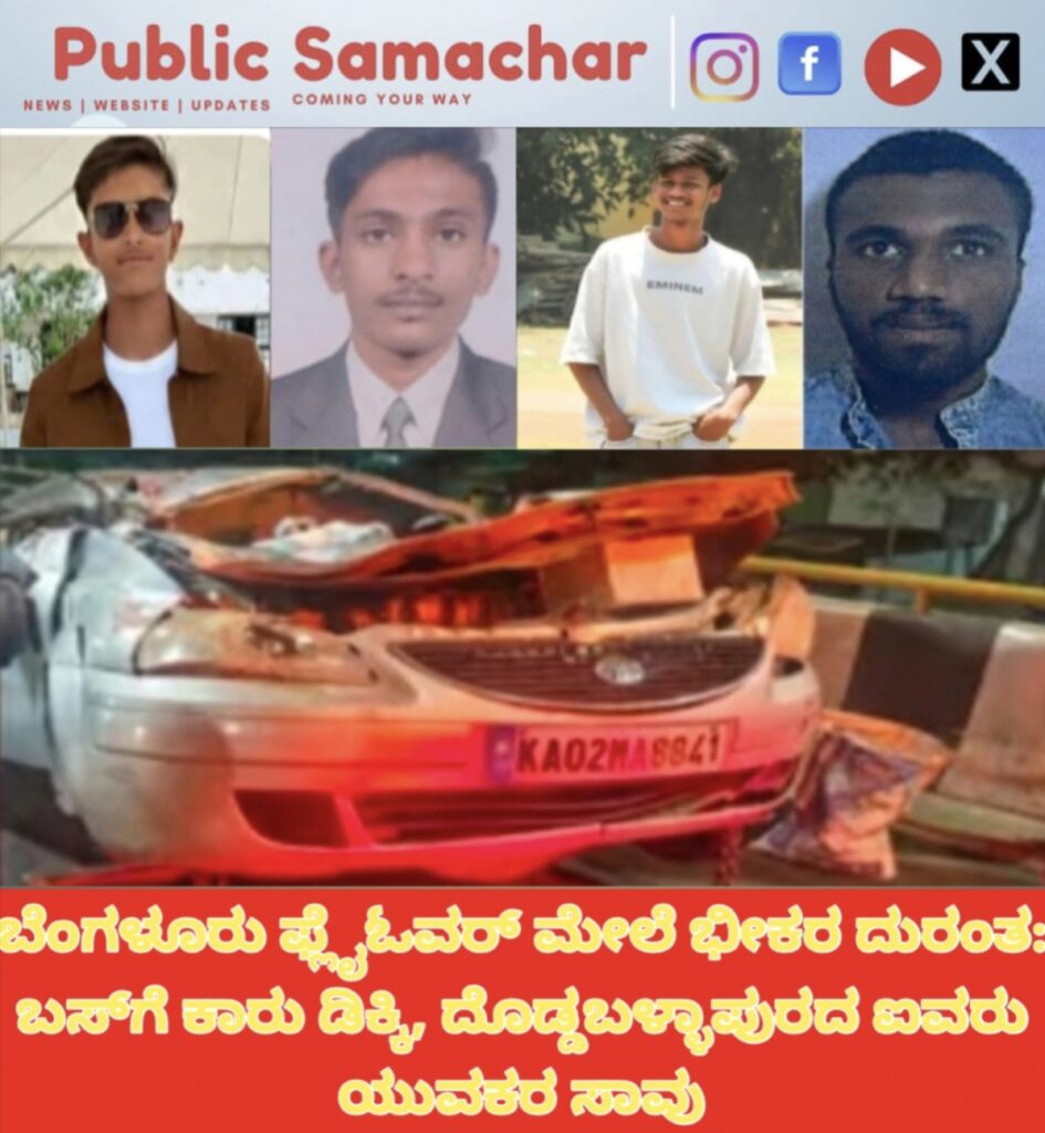 ಬೆಂಗಳೂರು ಫ್ಲೈಓವರ್ ಮೇಲೆ ಭೀಕರ ದುರಂತ: ಬಸ್‌ಗೆ ಕಾರು ಡಿಕ್ಕಿ, ದೊಡ್ಡಬಳ್ಳಾಪುರದ ಐವರು ಯುವಕರ ಸಾವು