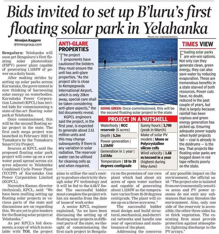 Bengaluru: While the state govt is contemplating setting up floating solar parks at Rachenahalli and Doddabommasandra lakes, a similar venture with the same configuration planned at Yelahanka in 2022 has found no takers. Karnataka Power Corporation Ltd (KPCL) planned to harness solar power at its Yelahanka Combined Cycle Power Plant (YCCPP) in June 2022, claiming it would be Bengaluru’s first floating solar photovoltaic (FSPV) power plant. But energy department sources say that till date, none have agreed to implement the project, causing officials to reconsider the proposal. While the latest proposal is a collaborative effort between Karnataka Renewable Energy Development Ltd (KREDL) and the civic agency’s climate action cell, with approval from Karnataka Tank Conservation and Development Authority (KTCDA), the Yelahanka project was solely proposed by KPCL. The power coporation planned to build a state-of-the-art floating solar park at its 6-acre raw water pond at YCCPP. It hoped to generate 1.1Mw of power daily. With temperatures varying between 10°C to 39°C, KPCL planned the plant on three-acres. KPCL engineers calculated about 3,700 sunny hours and generation of 2.6 million units annually. Since the project site is in the vicinity of Kempegowda International Airport, KPCL laid down the condition that the solar panels must have anti-glare properties. Acknowledging that KPCL hasn’t received any bids, a senior official from the energy department told TOI this is largely because of the project’s limited capacity. “While we planned to generate about 1.1Mw, many potential bidders found it was unviable economically,” the official said. “However, given our infrastructure, we could only afford a 1.1Mw plant. We will now decide on whether to pursue the project.” Meanwhile, engineers at KTCDA reveal KREDL and the civic agency want to use only 10% of the lakes’ total area. “Rachenahalli lake is spread over 105 acres and Doddabommasandra lake over 124 acres. Collectively, both lakes can generate about 20Mw. But to begin with, we’re only targeting the generation of 1Mw,” an engineer said. This isn’t the first time Karnataka is facing hurdles in setting up a floating solar park. Previously, the govt’s move to establish Karnataka’s first floating solar power park at Bugudanahalli lake on the outskirts of Tumakuru city, under the ambitious centrally funded Smart City project, also met with a poor response. The Rs 7.7-crore floating solar park at Tumakuru was supposed to generate about 20Mw. However, with no guarantee of water availability in the tank throughout the year, the project lost momentum and was shelved.