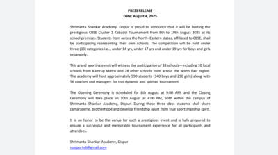 Beyond the competitive stakes, the tournament aims to promote team spirit, regional solidarity, and cultural exchange among participating students. While the focus remains firmly on performance, the school emphasised its commitment to creating an atmosphere of mutual respect, discipline, and sportsmanship.The CBSE Cluster Kabaddi Tournament has steadily grown in stature over the years, particularly in the Northeast, where grassroots-level interest in kabaddi continues to surge. With students competing from diverse social and cultural backgrounds, the event is expected to strengthen inter-school ties while showcasing emerging athletic talent in the region.Shrimanta Shankar Academy, known for its academic rigour and co-curricular engagement, is hosting a CBSE cluster-level kabaddi meet for the first time. The school administration sees the tournament as an opportunity to further its vision of holistic education and community-building through sports.
