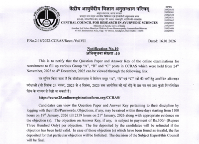 The Central Council for Research in Ayurvedic Sciences (CCRAS) has officially released the provisional answer key and question papers for the Group A, Group B, and Group C recruitment examination 2025. Candidates who appeared for the online written examination can now check the answer key by visiting the official website of CCRAS at ccras.nic.in.According to the official notice, the online examination for various Group “A”, “B” and “C” posts was conducted from November 24, 2025 to December 4, 2025 at different centres. The answer key has been released to help candidates match their responses and get an idea of their expected score before the final result is announced.Candidates can view their question paper and answer key discipline-wise by logging in through the official portal using their registered credentials.