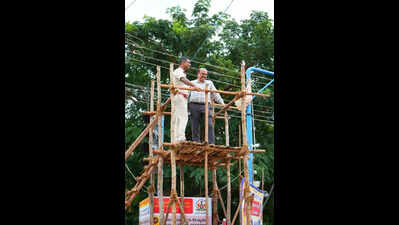Pic: Chitradurga DC T Venkatesh and SP Ranjit Kumar Bandaru inspect the preparations for the VHP Ganapati immersion to be held on SaturdayChitradurga: The city is abuzz with anticipation as the Ganapati immersion procession, organised by the Vishwa Hindu Parishad and Bajrang Dal, approaches. With an expected turnout of around 4 lakh people, the district administration left no stone unturned in ensuring that the event proceeded smoothly.The memory of the recent Maddur incident looms large, prompting an unprecedented security operation. Thousands of police personnel, including 7 SPs and 28 DySPs, have been deployed, staying in hostels across the city. The streets are lined with 151 CCTV cameras, 26 watch towers, and 49 sky sentries, while drones will be capturing every moment.A command centre at SJM Dental College will coordinate the efforts, with sectoral magistrates maintaining peace. Roads will be closed, and vehicles diverted, ensuring the procession’s path remains clear. Barricades surround the immersion site, and SDRF teams will be ready. Medical centres dot the route, staffed by specialist doctors and equipped with a 30-bed emergency ward.The deputy commissioner has banned DJs, paper blasting, and firecrackers, while social media is under scrutiny to prevent the spread of false information.