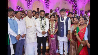 Hubballi: Chief minister Siddaramaiah, deputy chief minister DK Shivakumar, several ministers, and elected representatives attended the wedding reception of Naveen Kumar, son of MLA NH Konaraddi, and Sahana in Navalgund on Sunday. To mark the occasion, Konaraddi organised a mass marriage ceremony for 75 couples from different communities.Commending the initiative, Siddaramaiah said increasing inter-caste marriages is essential to eradicate the caste system in society. He also emphasised the importance of population control by limiting families to one or two children. “It is everyone’s responsibility to control the population, especially as India has already surpassed China,” he remarked.Shivakumar encouraged the newly married couples to be self-reliant and to build exemplary lives together. “All of you should become citizens of a garden of all religions, as envisioned by Kuvempu,” he said.Ministers Krishna Byre Gowda, HC Mahadevappa, Santosh Lad, along with seers, officials, and lakhs of Konaraddi’s supporters, attended the event.Konaraddi noted that he has been organising mass marriages frequently since 2005, and this year the programme was combined with his son’s wedding reception. “We were advised to host the marriage at Bengaluru Palace, but we chose Navalgund so that our people could easily participate,” he added.