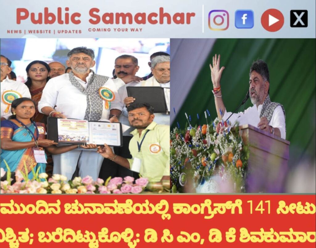 ಹಾವೇರಿ: “ರಾಜ್ಯದಲ್ಲಿ ಕಾಂಗ್ರೆಸ್ ಸರ್ಕಾರದ ಸಾಧನೆಗಳು ಜನಮನ ಗೆದ್ದಿವೆ. ಮುಂಬರುವ 2028ರ ವಿಧಾನಸಭಾ ಚುನಾವಣೆಯಲ್ಲಿ ಕಾಂಗ್ರೆಸ್ ಪಕ್ಷವು 141 ಸೀಟುಗಳನ್ನು ಗೆಲ್ಲುವುದು ಖಚಿತ. ನನ್ನ ಈ ಮಾತನ್ನು ಎಲ್ಲರೂ ಬರೆದಿಟ್ಟುಕೊಳ್ಳಿ,” ಎಂದು ಉಪಮುಖ್ಯಮಂತ್ರಿ ಡಿ.ಕೆ. ಶಿವಕುಮಾರ್ ಅವರು ಭವಿಷ್ಯ ನುಡಿದರು. ನಗರದಲ್ಲಿ ಶನಿವಾರ ಆಯೋಜಿಸಿದ್ದ ‘ರಾಜ್ಯ ಸರ್ಕಾರದ ಸಾವಿರ ದಿನಗಳ ಸಾಧನಾ ಸಮಾವೇಶ’ ಹಾಗೂ ‘ಭೂ ಗ್ಯಾರಂಟಿ ಸಮರ್ಪಣಾ ಸಮಾವೇಶ’ದಲ್ಲಿ ಪಾಲ್ಗೊಂಡು ಅವರು ಮಾತನಾಡುತ್ತಿದ್ದರು.