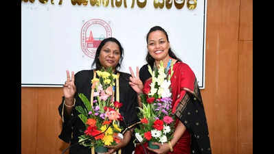Pic: Congress member Varsha Rajeev Jaane (L) of Kalaburagi City Corporation has been elected as mayor for the term of 23rd and Thripti Shivasharanappa Lakhe (R) from same party was elected as the deputy mayorKalaburagi: Congress party emerged victorious in the 23rd term election of the Kalaburagi City Corporation for the positions of mayor and deputy mayor on Thursday. Varsha Rajeev Jaane, representing the 43rd ward, was elected mayor with 36 votes. Thripti Sivasharanappa Lakhe of the 45th ward was chosen as deputy mayor, receiving 33 votes.In the BJP-JD(S) alliance, Gangamma Munnolli of the BJP contested for the mayoral post but got 28 votes. Vijayalakshmi Reddy, a JD(S) member, vied for the deputy mayor’s post from the same alliance and secured 31 votes.The absence of Rajya Sabha member Mallikarjun Kharge and Kalaburagi MP Radhakrishna influenced the results, with the Congress candidate attaining 36 votes due to the support of four JDS members. The election process commenced at 12.30pm at the town hall, overseen by Kalaburagi regional commissioner Zaheera Nasseem, who served as the election officer. The mayor’s post was reserved for a general lady, while the deputy mayor’s position was designated for an ‘IIB’ backward lady.Congress required 34 votes to achieve a simple majority but surpassed this benchmark by securing 36 votes, leading to Varsha Rajeev Jaane being declared as mayor. The Kalaburagi City Corporation comprises 55 members, with Congress holding 27 seats, BJP 23, and JD(S) 4. Including MLAs, MLCs, and MPs, the total votes tallied to 66, necessitating a simple majority of 34. Congress MLAs Allamprabhu Patil, Kaniz Fathima, and MLCs Chandrashekhar Patil, Tippanappa Kamanakanur, and Jagadev Guttedar supported the Congress candidate. BJP MLA Basavaraj Mattimud, MLCs Shashil Namoshi, Sunil Valyapure, and BG Patil backed the BJP.
