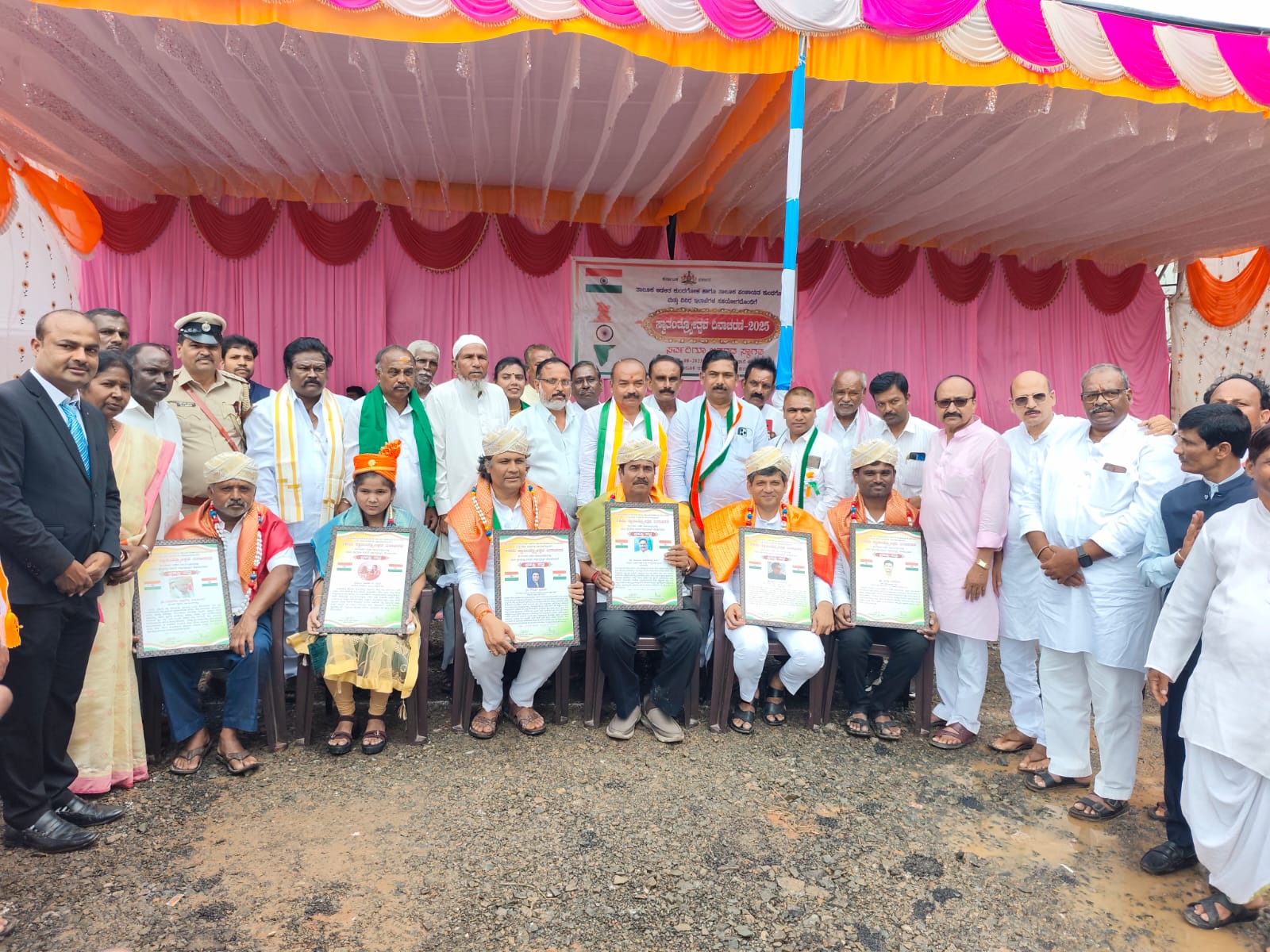 ಫೋಟೋ 1 ಕುಂದಗೋಳ:ಪಟ್ಟಣದ ತಹಶೀಲ್ದಾರ್ ಕಚೇರಿ ಆವರಣದಲ್ಲಿ ಶುಕ್ರವಾರ 79ನೇ ಸ್ವಾತಂತ್ರ್ಯ ದಿನಾಚರಣೆ ಸಮಾರಂಭದಲ್ಲಿ ವಿವಿಧ ಕ್ಷೇತ್ರದಲ್ಲಿ ಸಾಧನೆಗೈದ ಡಾ.ಅರವಿಂದ ಎಮ್ ಕಟಗಿ, ಗೌತಮ್ ಭಾಫನ, ಅಭಯ ಪಾರ್ಲೆಜಾ, ಕಿರಣ ಅರಮನೆ, ಕವಿತಾ ಕೆ ಎಮ್, ಬಸನಗೌಡ ಶೀಲವಂತರ ಅವರಿಗೆ ಶಾಸಕ ಎಂ ಆರ್ ಪಾಟೀಲ್ ಹಾಗೂ ಅವರು ತಹಸಿಲ್ದಾರ್ ರಾಜು ಮಾವರಕ ಸನ್ಮಾನಿಸಿ ಗೌರವಿಸಿದರು.