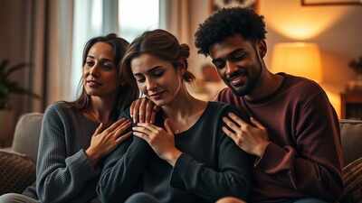 Three diverse friends in a softly lit living room. One is comforted by two others, showing empathy and support during a quiet crisis. Zodiac jewelry adds subtle detail.