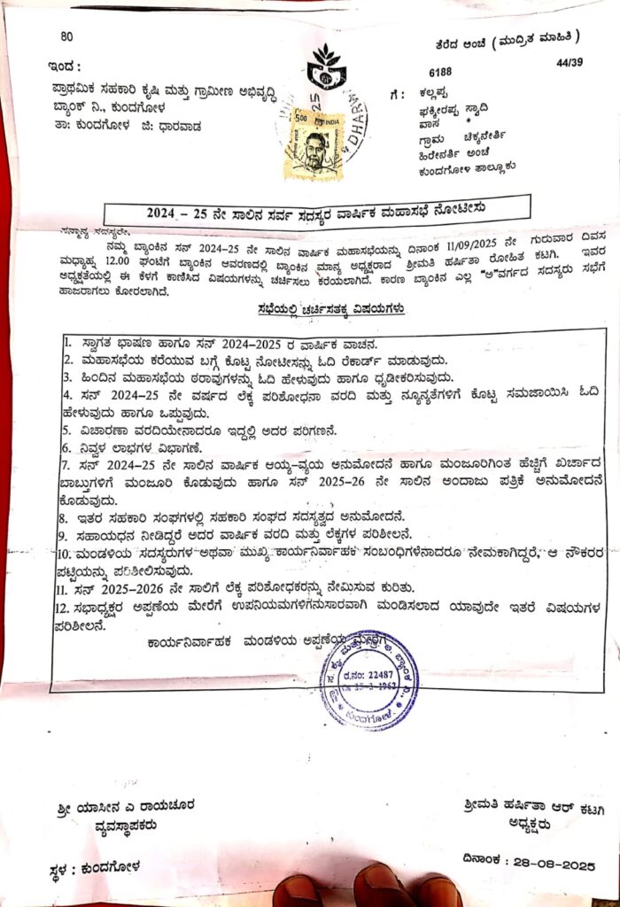 ಕುಂದಗೋಳ,: ಪಟ್ಟಣದ ಪಿಎಲ್ಡಿ ಬ್ಯಾಂಕ್ ಆವರಣದಲ್ಲಿ ಗುರುವಾರ ನಡೆದ ಸಾಮಾನ್ಯ ಸಭೆ ಮುಗಿಯುತ್ತಿದ್ದಂತೆ ರೈತರ ಅಸಮಾಧಾನ ಮತ್ತು ಆಕ್ರೋಶದ ಅಖಾಡವಾಯಿತು. “ರೈತರ ಹೆಸರಿನಲ್ಲಿ ನಡೆಯುವ ಬ್ಯಾಂಕ್ನಲ್ಲಿ ರೈತರಿಗೆ ಮಾತ್ರವೇ ನಿರ್ಲಕ್ಷ್ಯ” ಎಂದು ಸಭೆಯ ಮುಗಿಯುತ್ತಿದ್ದಂತೆ ಅನೇಕ ರೈತರು ಧ್ವನಿ ಎತ್ತಿದರು.