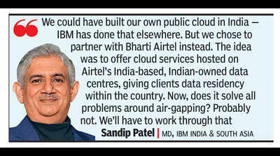 Bengaluru: Geopolitical realities are increasingly influencing how firms approach cloud adoption and data residency. If data is stored in an MNC-owned data centre, it inevitably raises concerns around sovereignty, compliance, and control. “We could have built our own public cloud in India — IBM has done that elsewhere. But we chose to partner with Bharti Airtel instead. The idea was to offer cloud services hosted on Airtel’s India-based, Indian-owned data centres, giving clients data residency within the country. Now, does it solve all problems around air-gapping? Probably not. We’ll have to work through that,” Sandip Patel, MD of IBM India & South Asia, told TOI recently.Patel believes many companies are increasingly worried about jurisdictional exposure. “I think many companies are worried — tomorrow, if we are on a public cloud owned and operated by a US company, and given the geopolitical circumstances, if the US says, ‘I want to subpoena that data,’ what option do you have? There are ways to protect it with bring-your-own-keys and other security keys,” he added. By partnering with Airtel, IBM says it has created a resilient, India-based alternative. The data centres and network are owned by Airtel, while IBM brings global cloud management and optimisation capabilities. Airtel and IBM will help enterprises scale AI workloads efficiently, delivering interoperability across on-premise, multi-cloud, and edge infrastructure.At the recent IBM Think 2025 event in Mumbai, Patel said data residency is a critical business value driver, ensuring that data and control planes remain within national borders. He defined this new era as governed by five principles: hybrid by design, open by nature, compliant with local laws, built for resilience, and cost-optimised.Even as tech firms seek to address rising concerns over “tech colonisation,” many countries are striving to reduce reliance on foreign technology providers. “Govts globally are becoming more protective of data — look at GDPR, for instance. And yes, India too is taking steps to ensure data sovereignty while encouraging innovation. I commend the government’s Atmanirbhar Bharat push. Being self-reliant in key technology areas is a good thing. IBM has been supporting this — for instance, we’ve offered our architecture to IIT Madras for the Shakti processor initiative, which aims to build India’s own server technology. While we’re a global MNC, we’re also deeply committed to India’s technology ecosystem.” Patel said the public cloud is becoming cost-prohibitive, and clients are looking for hybrid models that combine the agility of cloud with the control of on-prem. “That’s where IBM’s credibility comes from — our Data Stewardship Manifesto, published eight years ago after developments in the EU, makes it clear: Data and insights belong solely to the client. IBM will not take ownership of or reuse client data — explicitly or implicitly, with or without permission. Clients are asking us how they can virtualise our infrastructure to gain flexibility and cost efficiency while keeping control of their data.”