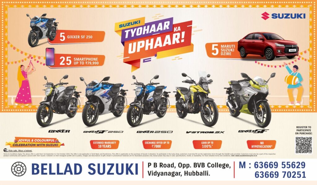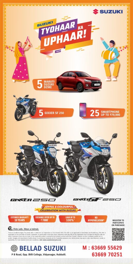 ಹುಬ್ಬಳ್ಳಿ: ಹಬ್ಬದ ಸಡಗರಕ್ಕೆ ಹೊಸ ರಂಗು ತುಂಬಲು ಸುಜುಕಿ ಮೋಟಾರ್‌ಸೈಕಲ್ ಸಂಸ್ಥೆ ‘ಸುಜುಕಿ ಹಬ್ಬ ಕಾ ಉಪಹಾರ್’ ಹೆಸರಿನಲ್ಲಿ ಆಕರ್ಷಕ ಕೊಡುಗೆಗಳನ್ನು ಪ್ರಕಟಿಸಿದೆ. ಈ ಕೊಡುಗೆಗಳು ಸೆಪ್ಟೆಂಬರ್ 1 ರಿಂದ ಅಕ್ಟೋಬರ್ 31, 2025 ರವರೆಗೆ ಲಭ್ಯವಿವೆ.