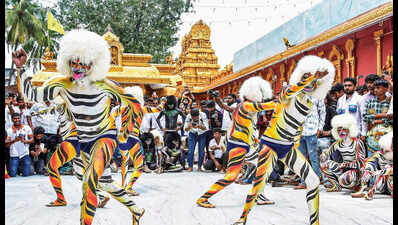 Pics: Ravi PosavanikeMangaluru has exploded into a vibrant spectacle for Dasara, with the Kudroli Sri Gokarnanatha Temple at its heart. This year’s festival is defined by three major highlights: the commencement of grand temple rituals, a massive cultural showcase featuring over 1,500 artistes, and the electrifying energy of the traditional tiger dance (hulivesha). The tiger dance, or hulivesha, is a traditional folk dance, where dancers paint their bodies with stripes and don tiger masks to imitate the movements of a tiger, symbolising strength and valour.