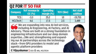 Bengaluru: HCLTech’s constant currency revenue rose by 2.4% sequentially and 4.6% year-over-year in the Sept quarter, with the annual growth approaching the upper end of its guidance signalling a broad-based performance. This growth comes amid a cautious business environment, where even larger peer TCS posted only 0.8% sequential constant currency growth and a 3.3% year-on-year decline for the same quarter. Buoyed by the strong performance and sustained momentum, HCLTech has raised its full-year services revenue guidance to 4–5% in constant currency, up from the earlier 3–5%. However, due to continued softness in the software segment, the overall company-level revenue guidance remains unchanged at 3–5% in constant currency. The company reported that its advanced AI revenues reached $100 million, accounting for 3% of total revenue.HCLTech also announced that, for the first time, it crossed the $2.5 billion mark without signing a mega deal. Among the deals closed between July and Sept were two large contracts that were delayed in the previous quarter. “Our strategy is focused on shaping the future of our business and the industries we serve,” said CEO C Vijayakumar. “There are four key components to this strategy. First, we are proactively transforming our services with a long-term view, even if it means disrupting parts of our existing revenue base. Second, we continue to invest in differentiated intellectual property that accelerates and scales AI adoption for our clients. While companies like OpenAI, tech OEMs, and hyperscalers advance the intelligence layer and computing capabilities, our opportunity lies in making that intelligence enterprise-ready and impactful at scale.” Vijayakumar added that HCLTech is building IP to drive transformation across IT, software lifecycle development (SLDC), engineering, and BPO services, along with industry-specific use cases built on top of that intelligence layer. “We are expanding into new AI-led services, including AI Engineering, AI Factory, and AI Advisory. These are built on a strong foundation in engineering infrastructure and our deep domain expertise,” he said. “The fourth element of our strategy is strengthening and expanding our AI partnerships across the technology stack—from GPU providers to model and agentic platform providers.”Regionally, the company’s largest market, the US, grew 2.4% year-on-year in constant currency. Europe saw a stronger performance, growing 7.6%, while India remained largely flat at 0.6%. The rest of the world posted a robust 17.9% growth.Among industry verticals, BFSI grew 11.4%, technology 13.9%, and telecom 11.7% year-on-year. Retail and public services grew 5.5% and 2.2%, respectively. Manufacturing and life sciences underperformed, reporting declines of 1.8% and 3%, respectively. Operating margins improved to 17.5% in the Sept quarter, up from 16.3% in the June quarter, aligning with the mid-point of the company’s guidance. However, margins declined compared to the same quarter last year, when they stood at 18.6%.HCLTech has made a net 3,489 employees during the Sept quarter, bringing the total headcount to 2.2 lakh employees. Its CHRO Ramachandran Sundararajan said the company will discontinue quarterly variable pay and integrate it into monthly salaries. The change is aimed primarily at benefiting junior employees, for whom project-level performance was a component of their compensation. The annual performance bonus will continue as part of the company’s compensation policy.