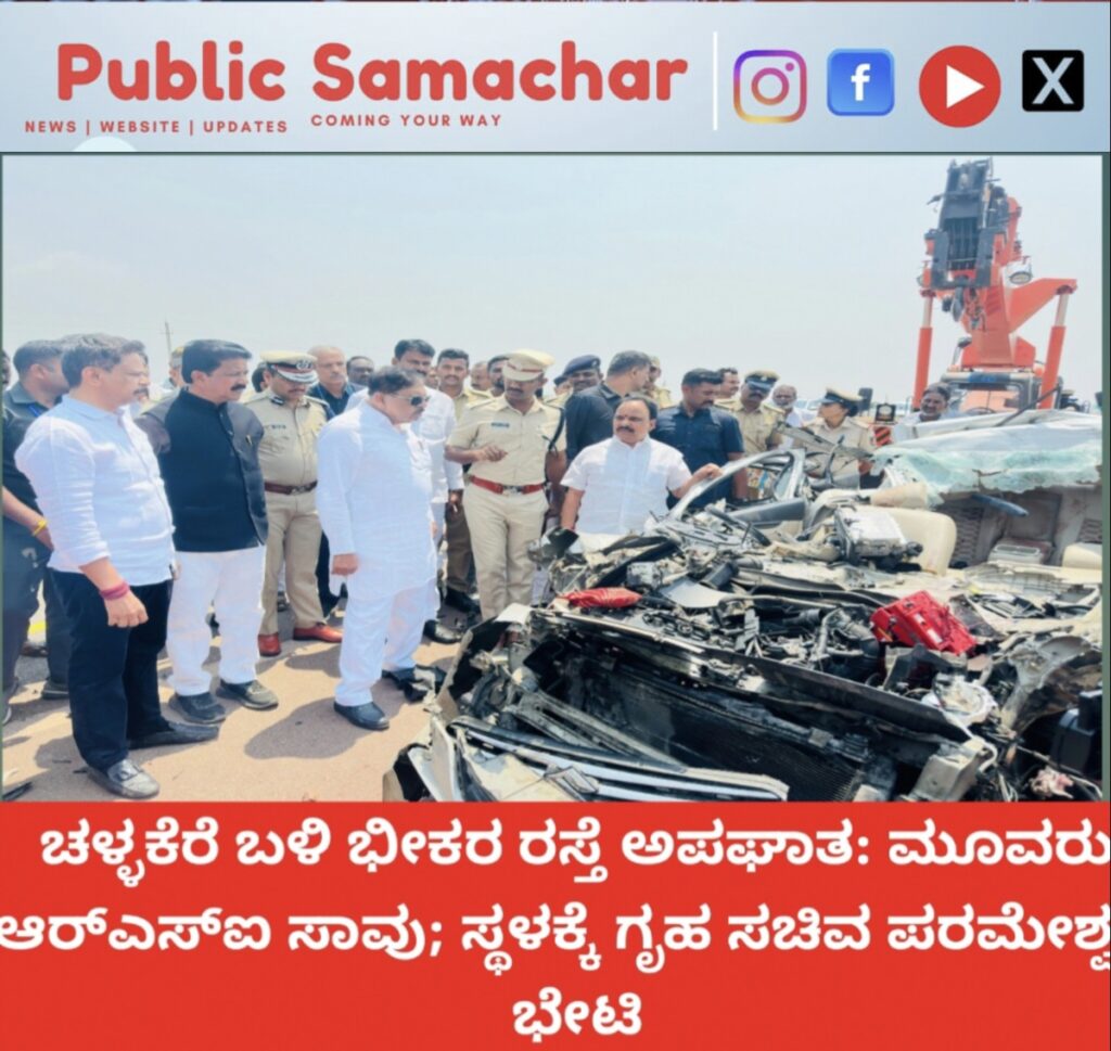ಚಿತ್ರದುರ್ಗ: ಜಿಲ್ಲೆಯ ಚಳ್ಳಕೆರೆ ತಾಲ್ಲೂಕಿನ ಹೆಗ್ಗೆರೆ ಬಳಿಯ ರಾಷ್ಟ್ರೀಯ ಹೆದ್ದಾರಿಯಲ್ಲಿ ಸಂಭವಿಸಿದ ಭೀಕರ ರಸ್ತೆ ಅಪಘಾತದಲ್ಲಿ ಮೂವರು ರಿಸರ್ವ್ ಸಬ್ ಇನ್‌ಸ್ಪೆಕ್ಟರ್‌ಗಳು (RSI) ಸಾವನ್ನಪ್ಪಿರುವ ಘಟನೆ ತೀವ್ರ ವಿಷಾದ ಮೂಡಿಸಿದೆ. ಘಟನಾ ಸ್ಥಳಕ್ಕೆ ಗೃಹ ಸಚಿವ ಡಾ. ಜಿ. ಪರಮೇಶ್ವರ ಅವರು ಭೇಟಿ ನೀಡಿ ಪರಿಶೀಲನೆ ನಡೆಸಿದ್ದು, ಮೃತರ ಕುಟುಂಬಸ್ಥರಿಗೆ ಸಾಂತ್ವನ ಹೇಳಿದ್ದಾರೆ.