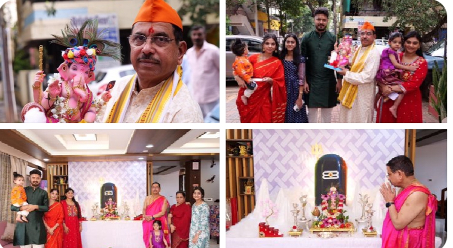 ಹುಬ್ಬಳ್ಳಿ: ಕೇಂದ್ರ ಸಚಿವರಾದ ಪ್ರಲ್ಹಾದ ಜೋಶಿ ಅವರು ಗಣೇಶ ಚತುರ್ಥಿಯ ಶುಭ ಸಂದರ್ಭದಲ್ಲಿ ತಮ್ಮ ಹುಬ್ಬಳ್ಳಿಯ ನಿವಾಸದಲ್ಲಿ ಕುಟುಂಬದ ಸದಸ್ಯರೊಂದಿಗೆ ಗಣೇಶ ಮೂರ್ತಿಯನ್ನು ಪ್ರತಿಷ್ಠಾಪಿಸಿ, ವಿಶೇಷ ಪೂಜೆ ಸಲ್ಲಿಸಿದರು. ಸಾಂಪ್ರದಾಯಿಕ ಶ್ರದ್ಧಾಭಕ್ತಿಯೊಂದಿಗೆ ನಡೆದ ಈ ಪೂಜಾ ಕಾರ್ಯಕ್ರಮದಲ್ಲಿ ಸಚಿವರು ಹಾಗೂ ಅವರ ಕುಟುಂಬದವರು ಸಡಗರದಿಂದ ಭಾಗವಹಿಸಿದರು.