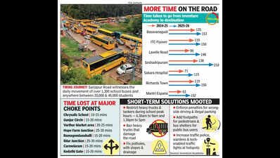Bengaluru: Every day, a whopping 35,000 children on Varthur-Sarjapur Road in the city’s tech corridor are stuck in a grind that has nothing to do with studies. Becoming the collateral damage of the notorious gridlocks triggered by decades of political and official apathy, each student is estimated to lose up to 600 hours a year in traffic.In fact, according to a study conducted by a private school on Sarjapur Road, its school buses take 32% more time to reach their destinations this year compared to the previous academic year. The road, which has over 30 unaided schools and several govt schools, witnesses the daily movement of over 1,300 school buses and anywhere between 35,000 and 40,000 students.Even as many schools and students have resigned themselves to their fate, Inventure Academy, an international school, decided to work towards finding solutions by initiating a campaign titled ‘Our Mobility, Our Voice’. As part of the campaign, students analysed the GPS data of 61 buses of the school to find patterns. The results were astounding: a quarter of the students’ lives was found to be spent on the roads.“The amount of time our students waste on roads is unacceptable. If we calculate it, students spend 180 minutes on the road every day on average, which is about 600 hours per year. That means students lose the amount of time equivalent to one term every two years. Traffic is costing children their time for learning, play, well-being, and family,” said Nooraine Fazal, founder of Inventure Academy. “We’ve raised our concerns with the police commissioner, and they are actively working on it,” she added. The school calculated the time taken for its buses to reach each of their stops since 2019 during the return journey. For instance, the journey to Prestige Falcon City was 130 minutes in Aug 2019. It reduced to 108 in 2022-23, before rising to 128 in 2023-24, 146 in 2024-25, and finally 164 in 2025-26. The students have also identified issues at critical hotspots and recommended suggestions to rectify them. For instance, Dommasandra has broken roads, potholes, and an incomplete flyover further narrowing the road. Resurfacing roads, restricting heavy vehicles during peak hours, and fast-tracking flyover completion should help, stated the report. In Gunjur, high volumes of traffic, narrow roads, and private pickup/drop-off vehicles add to the congestion. Enforcing in-campus pickup/drop-off and more police at choke points, along with the widening of roads, will help, the report stated. The school has also recommended enforcing penalties for wrong-side driving and illegal parking, both of which are a nuisance in the area.