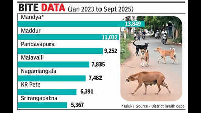 Mandya: The stray dog issue in Mandya district has escalated to alarming levels, with packs of dogs roaming freely across many towns and villages. Fear-stricken residents are increasingly reluctant to step out, particularly during early mornings and late evenings.District health officer (DHO) Dr Mohan disclosed that a total of 61,208 people have been bitten by dogs over the past two years and nine months, from Jan 2023 to Sept 2025. Among the taluks, Mandya reported the highest number of cases with 13,849, followed by Maddur (11,032), Pandavapura (9,252), Malavalli (7,835), Nagamangala (7,482), KR Pete (6,391), and Srirangapatna (5,367). In 2023 alone, the district registered 26,270 cases; last year saw 18,355 cases, and up to Sept this year, 16,583 cases have been reported.Hospitals continue to record new dog-bite incidents daily, many involving children. Young victims have become frequent targets of aggressive stray dogs, increasing concerns among parents and residents. Despite the worsening crisis, authorities have not yet implemented effective measures to control the stray dog population. Citizens are calling for urgent intervention to prevent further injuries or potential fatalities.Dr Mohan, DHO, said, “All primary health centres across the district are well equipped to handle dog-bite cases. In cases of rabies-related bites, taluk and general hospitals are prepared to administer the rabies immunoglobulin (RIG) vaccine. Those bitten by rabies-infected dogs must receive the vaccination within 48 hours of the incident.”For the 2025–26 fiscal year, deputy commissioner Kumara has set a target of sterilising 5,000 stray dogs under the Animal Birth Control (ABC) and Anti-Rabies Vaccination (ARV) programmes. Referring to the 21st livestock census, Kumara stated that the district has 24,615 pet dogs and 51,531 stray dogs, totalling 76,146 dogs. On resource allocation, Kumara noted that the Mandya City Municipality has allocated Rs 60 lakh this year exclusively for stray dog sterilisation. Urban local bodies are permitted to allocate 2% of their annual budgets for ABC and ARV initiatives. The animal husbandry department has been directed to coordinate with local bodies to ensure the effective utilisation of these funds.
