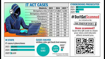 Mysuru: Cybercrooks continue to swindle money from bank customers in Karnataka and are now targeting customers in tier-II and III cities.According to the data shared by home minister G Parameshwara, while replying to a query about Karnataka during the ongoing assembly session, in the first seven months of 2025, about 8,620 cases were reported. The metropolitan city of Bengaluru topped the list with 6,301 cybercrime cases, followed by Bengaluru Rural district with 258 cases. This year, cybercriminals tricked 250 people in Vijayapura district, which is in third place.With 151 cases, Tumakuru is in fourth place, and Bengaluru South, Chikkaballapura, and Udupi have witnessed more than 100 cases this year.An officer said Mysuru, which witnesses an average of 250 cases a year, recorded 98 cases in 7 months this year, and people lost about Rs 25 crore in online frauds.The data reveals that despite the high number of reported cases, the rate of successful prosecution and punishment of offenders is low. Out of 53,000 reported cybercrime cases since April 2023, in the last 28 months, only 70 offenders were punished. On an average, the state recorded 22,000 cases every year, and this year, in seven months, 8,600 were reported. However, the police were successful in addressing only about 8,000 complaints, which is roughly 15% of the total cases.The home minister also revealed that to expedite investigations into cyberfraud cases, 43 new cybercrime police stations have been established, and officers in the rank of deputy superintendent of police are appointed as Station House Officers (SHOs) for quality investigations. Besides, training for officers is being provided to enhance their skills in detecting and investigating cyber frauds.A new cyber investigation manual has been developed to facilitate swift and logical investigations into new types of online cyberfrauds. The govt has also issued an order to appoint a total of 16 cyber technical experts, including 8 cyber security analysts and 8 digital forensic analysts, on a contract basis in Bengaluru to tackle cybercrimes. Six digital forensic analysts and 2 cyber security analysts have been appointed to the Bangalore city police unit, the minister replied.An officer in Mysuru said that the previous year about Rs 49 crore were lost in cybercrimes in Mysuru city, and this year already Rs 25 crore has been lost to cybercrooks. Two women, both senior citizens, were duped, and about Rs 2 crore were swindled from their bank accounts. Investment frauds top the cybercrime list, followed by job fraud, digital arrests, and KYC verification. Police have also successfully resolved online fraud cases booked under the IT Act and helped bank customers to get back a portion of lost money after freezing the receiver’s account, but it has happened in those cases reported immediately within a day after the fraud.
