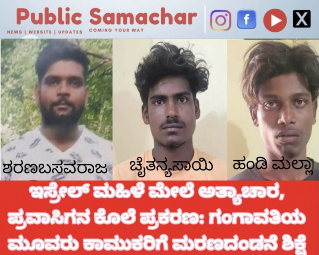 ಕೊಪ್ಪಳ: ಜಿಲ್ಲೆಯ ಗಂಗಾವತಿ ತಾಲ್ಲೂಕಿನ ಸಾಣಾಪುರದಲ್ಲಿ ನಡೆದಿದ್ದ ವಿದೇಶಿ ಪ್ರವಾಸಿ ಮಹಿಳೆ ಹಾಗೂ ಹೋಂ ಸ್ಟೇ ಒಡತಿಯ ಮೇಲಿನ ಅತ್ಯಾಚಾರ ಮತ್ತು ಒಡಿಶಾ ಮೂಲದ ಪ್ರವಾಸಿಗನ ಭೀಕರ ಹತ್ಯೆ ಪ್ರಕರಣಕ್ಕೆ ಸಂಬಂಧಿಸಿದಂತೆ ಇಲ್ಲಿನ ಒಂದನೇ ಹೆಚ್ಚುವರಿ ಜಿಲ್ಲಾ ಮತ್ತು ಸಷೆನ್ಸ್ ನ್ಯಾಯಾಲಯವು ಐತಿಹಾಸಿಕ ತೀರ್ಪು ನೀಡಿದೆ. ಪ್ರಕರಣದ ಮೂವರು ಅಪರಾಧಿಗಳಿಗೆ ನ್ಯಾಯಾಲಯವು ಮರಣದಂಡನೆ ಶಿಕ್ಷೆ ವಿಧಿಸಿ ಆದೇಶ ಹೊರಡಿಸಿದೆ. ಗಂಗಾವತಿಯ ಸಾಯಿನಗರದ ನಿವಾಸಿಗಳಾದ ಮಲ್ಲೇಶ್ ಅಲಿಯಾಸ್ ಹಂದಿಮಲ್ಲ, ಸಾಯಿ ಅಲಿಯಾಸ್ ಚೈತನ್ಯಸಾಯಿ ಹಾಗೂ ಶರಣಪ್ಪ ಅಲಿಯಾಸ್ ಶರಣು ಬಸವರಾಜ್ ಎಂಬುವವರೇ ಗಲ್ಲು ಶಿಕ್ಷೆಗೆ ಗುರಿಯಾದ ನराधಮರು.