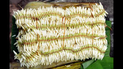 Mangaluru: The perishable commodity most sought after during the festive season is flowers, especially Shankarapura jasmine. This year, the prices have risen due to low yield, thanks to the continuing unseasonal rains. The famed Shankarapura jasmine, which normally retails for Rs 600 to Rs 800 per atte (a local measure) during normal festive times with an average crop, this year touched a record high of Rs 2,150 per atte, with less than 20% of the produce reaching the market.The high demand and low supply situation saw the price of Shankarapura jasmine, which was accorded geographical indication (GI) status in 2008, remain steady at Rs 2,100-Rs 2,200 for the past few days, says Abubakar Kolnad, a wholesale merchant in Mulki. Other than procuring jasmine locally, he gets his chrysanthemums and marigolds from Mangaluru, the main supply of which reaches the city from Hassan, Chitradurga, Mysuru, or Tumakuru.Flower merchants note that usually high prices mean very few takers, but this festive season prices have not deterred buyers since they require a certain amount for the festivities. Even chrysanthemums aren’t cheap. One kucchu (a local measure roughly equalling 70-80 ft) was priced at Rs 1,800 as against Rs 500 to Rs 600 available during normal times.The growers also have it bad. Manjunath Patkar, a grower from Bantakallu in Udupi, says though the normal crop in the region gives flowers equal to 10 atte, this year it has been only 20% of the yield. The untimely rain in Sept that continued in Oct, saw plants get rotten due to water stagnation.Ramakrishna Sharma Bantakallu, who has a large number of plants in his plantation, says the crop is down by 75%. “The supply has been hit as the majority of the growers’ crops, nearly 80%, have been decimated due to rain. So what reaches the market is not even a quarter of the actual crop that used to reach during normal times in these months. So prices have soared. Conversely, if the crop was good, prices would have stabilised at Rs 800 to Rs 900 per atte,” he notes. Shankarapura jasmine has a good demand all over the region, especially in Mangaluru and Mumbai. There are more than 10,000 families engaged in jasmine cultivation in the coastal districts extending from Kasaragod to Uttara Kannada, with a maximum number of 8,000 families being in Udupi district. The lowest rate for an atte hovers between Rs 80 and Rs 100 during the off-season.