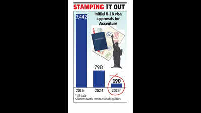 Bengaluru: Accenture CEO Julie Sweet said H-1B visas are not a major concern for the company, noting that just 5% of its US workforce is on such visas.“This is really a non-issue because we only have about 5% of our people in the US on H-1B visas, and they’re for really specialised experience and skills for our clients. Not something that’s really a big impact on Accenture,” she said during an earnings call on Thursday.A Kotak Institutional Equities report showed that Accenture steadily reduced its reliance on H-1B visas, with initial approvals dropping to 190 in the first nine months of 2025, compared with 3,442 in 2015. The figure stood at 798 last year. Accenture’s headcount declined by 11,419 sequentially in the Sept quarter, bringing the total to 7.7 lakh employees, including more than 3.5 lakh in India.Accenture CFO Angie Park said the company launched a six-month business optimisation programme in Q4, recording a $615-million charge, with an additional $250 million expected in Q1, taking the total to about $865 million. “The business optimisation programme has two parts: one related to rapid talent rotation that Julie mentioned, which reflects severance associated with headcount reductions that we are making in a compressed timeline, and second, related to the divestiture of two acquisitions that are no longer aligned with our strategic priorities. These actions will result in cost savings, which will be reinvested in our people and our business,” Park said. Sweet said that in FY26, Accenture plans to increase its headcount across its three markets, including in the US and Europe, reflecting the demand it sees in the business. “In addition to continuing to hire world-class talent, in FY25, we developed and are implementing a refreshed, robust three-pronged talent strategy to rotate our workforce. We are investing in upskilling our reinventors, which is our primary strategy,” she said.Accenture has also been expanding its AI capabilities. In FY23, it had 40,000 AI and data professionals, with only around 30 employees working on a handful of generative AI projects generating negligible revenue. Today, the company has 77,000 AI and data professionals. “We worked on more than 6,000 advanced AI projects just this year, and we delivered meaningful revenue in FY25,” Sweet added.For FY25, Accenture reported revenue rose 7%, with growth across all verticals and geographies. The operating margin rose to 15.6%, expanding by 10 basis points (100bps = 1 percentage point) from the previous year. Of the total revenue growth, 4% was organic and 3% was inorganic. Accenture follows a Sept-Aug financial year.In Q4, revenue was up 4.5% with all geographies reporting growth, though healthcare declined 3%, while other verticals expanded. By industry group, media & technology grew 6%, BFSI rose 10%, health & public service increased 7%, and products advanced 8%. Regionally, Q4 revenues grew 5% in local currency in the Americas, 3% in EMEA, and 6% in Asia-Pacific. By vertical, communications, media & technology increased 7%, while financial services led with 15% growth. For FY26, Accenture has guided revenue growth in the range of 2-5%, including about 1.5% from inorganic contribution. In Q4, the company added 37 clients with quarterly bookings above $100 million, taking the total to a record 129 for the year. It also ended FY25 with 305 Diamond clients, representing its largest relationships. Accenture highlighted that its early decision in FY23 to commit $3 billion over multiple years to lead in generative AI is paying off. In FY25, revenue from generative and agentic AI tripled from FY24 to $2.7 billion, while bookings nearly doubled to $5.9 billion.