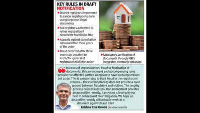 Bengaluru: In a major overhaul aimed at protecting property buyers from fraud, the state govt has issued draft rules that allow district registrars to cancel registrations executed using forged or illegal documents — a move that previously required court intervention. The rules also enable sub-registrars to refuse registration if documents are found to be fake, marking a significant shift in the state’s registration framework.The Karnataka Registration (Refusal and Cancellation of Registered Documents) Rules 2025 were released Friday, with the govt inviting public objections and suggestions within 15 days before finalising them. The move is intended to plug long-standing loopholes that have enabled misuse of the document registration system.Under the draft rules, a district registrar can annul fraudulent registrations either suo motu or based on a complaint. Affected parties may appeal within three years. If fraud is discovered after the appeal period lapses, citizens can approach the inspector general of registration (IGR) for cancellation. Both authorities must verify documents and hear all sides before issuing a cancellation order.Mullai Muhilan MP, IGR and commissioner of stamps, told TOI there was no provision for sub-registrars to refuse the registration of any documents, and the govt also did not have any power to cancel registration. “So, the govt brought in an amendment to the registration Act giving the provision for district registrars to cancel registrations done based on forged documents. To implement the Act effectively, the department has framed draft rules,” he said.He added that the final rules would be notified after examining public submissions. “The final rules will be published soon after verifying objections or suggestions from the public. It is a strong move to curb any illegality in property registration. It will protect the innocent public, safeguard their properties from fraudsters,” said Muhilan.To strengthen checks, registering officers will cross-verify documents against an integrated electronic database maintained by the IGR. Any mismatch allows the officer to refuse registration, with reasons recorded in writing.The draft rules also outline protection for properties attached by courts or investigative agencies such as the Enforcement Directorate, Central Bureau of Investigation, and state units. Registering officers must consult the IGR’s electronic register of attachments before processing any document for such properties.The IGR has also called for objections and suggestions. Citizens can send their feedback to the principal secretary, revenue department (stamps & registration and disaster management), 6th floor, MS Building, Dr BR Ambedkar Veedhi, Bengaluru, within the stipulated time frame.