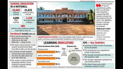 Bengaluru: In a major step towards transforming Karnataka Public Schools (KPS) into a benchmark for quality education in the govt sector, the department of school education and literacy is set to unveil an exclusive policy dedicated to these institutions within the next fortnight.The policy, aimed at streamlining administration, improving academic outcomes, and ensuring better accountability, comes at a time when the state is expanding the KPS network. Earlier this week, minister for school education and literacy, Madhu Bangarappa, announced the establishment of 800 new Karnataka Public Schools. Of these, 500 will be funded by the Asian Development Bank, 200 by Kalyana Karnataka Regional Development Board, and 100 by Karnataka Mining Environment Restoration Corporation (KMERC). Issues in KPS modelSome of the major issues in the existing KPS model, identified by the education department, include lack of continuous departmental monitoring, frequent teacher transfers, and fragmented administration. Also, a student studying from lower to higher classes within the same KPS often requires multiple transfer certificates, as each section of the school has separate UDISE (Unified District Information System for Education) codes.Currently, some of the schools operate multiple bank accounts — sometimes up to four — leading to inefficient fund management and underutilisation. The new KPS policy aims to address these issues through administrative consolidation and structural reforms. Ensuring stability in staffing, the department plans to amend the Karnataka State Civil Services (Regulation of Transfer of Teachers) Act, introducing a minimum tenure of 10 years for teachers at a KPS. Additionally, a special eligibility test will be implemented for teacher appointments to maintain high academic standards.Every KPS will have a governing body headed by a pre-university college principal, with high school and primary school heads as vice-chairpersons. The SDMC, chaired by the respective MLA, will jointly manage a single bank account. The governing body will meet at least once every two weeks to monitor performance and address issues.The policy will also set uniform infrastructure and academic standards. Smaller schools within a 3-5km radius will be consolidated into magnet schools with up to 1,200 students, selected based on enrolment, grades, location, and infrastructure. All KPS institutions will adopt a bilingual system from LKG to class 5, transitioning to a single medium from classes 6-10, with activity-based, high-quality teaching methods.High school education will focus on STEAM (science, technology, engineering, arts, and mathematics), vocational training, career counselling, competitive exam preparation, and skills such as creativity, critical thinking, collaboration, and communication, paving the way for a holistic, future-ready education system in Karnataka’s public schools.Box 1State’s school education in nutshell* 19,603 primary schools* 21,676 upper primary schools* 4,895 high schools* 1,319 pre-university colleges* Only 309 schools currently offer a combined system from LKG to class 12Box: 2Enrolment Trends (2015–25)* Govt school enrolment has declined from 47.1 lakh (2015–16) to 38.2 lakh (2025–26) — a drop of 19%* The share of govt schools in total student enrolment has fallen from 46% to 38% over the decade* In contrast, private unaided schools have seen enrolment rise from 36.3 lakh (2015–16) to 47 lakh (2025–26)* The number of govt schools with 50 or fewer students has increased sharply to 25,683 in 2025–26Box 3Learning IndicatorsGross Enrolment Ratio (GER)Primary level – 98.7%Upper primary level – 99.8%Secondary level – 96.1% Dropout RateLower primary – 2.5%Upper primary – 2.9%Secondary – 22.9%* Figures rounded off | department of school education and literacy Box 4KPS — Key Statistics* Launched in 2018–19 with 176 schools across the state* The network has now expanded to 309 schools* The average enrolment per KPS was about 785 students in 2021* The average enrolment is projected to rise to around 819 students by 2025–26* The Class 10 pass rate in KPS schools stands at 79.9%Quote hangerFrom the point of view of educational quality, KPS is a welcome step. However, I request that KPS teachers should not be transferred for 10 years. The eligibility test for in-service teachers should be dropped— Chidanand A Patil, state vice-president, Karnataka State Middle School Teachers’ Association (R), Bengaluru