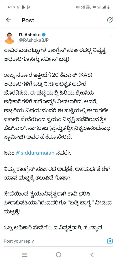 ​ಸರ್ಕಾರದ ಈ ಎಡವಟ್ಟನ್ನು ಕಟುವಾಗಿ ಟೀಕಿಸಿರುವ ಅಶೋಕ್ ಅವರು, “ಸಾವಿರ ಎಡವಟ್ಟುಗಳ ಕಾಂಗ್ರೆಸ್ ಸರ್ಕಾರದಲ್ಲಿ ನಿವೃತ್ತ ಅಧಿಕಾರಿಗೂ ಸರ್ವಿಸ್ ಬಡ್ತಿ ಸಿಗುತ್ತಿದೆ” ಎಂದು ವ್ಯಂಗ್ಯವಾಡಿದ್ದಾರೆ. ಕೆಎಎಸ್ ಅಧಿಕಾರಿಯಾಗಿದ್ದ ಎಚ್.ಎಲ್. ನಾಗರಾಜ ಅವರು ಈಗಾಗಲೇ ಸ್ವಯಂ ನಿವೃತ್ತಿ ಪಡೆದು, ಪ್ರಸ್ತುತ ಶ್ರೀ ನಿಶ್ಚಲಾನಂದನಾಥ ಸ್ವಾಮೀಜಿಯಾಗಿ ಪೀಠಾಧಿಪತಿಯಾಗಿದ್ದಾರೆ. ಆಧ್ಯಾತ್ಮಿಕ ಜೀವನ ನಡೆಸುತ್ತಿರುವವರಿಗೂ ಬಡ್ತಿ ನೀಡುವ ಮೂಲಕ ಸರ್ಕಾರ ತನ್ನ ಅಸಮರ್ಥತೆಯನ್ನು ಜಗಜ್ಜಾಹೀರು ಮಾಡಿದೆ ಎಂದು ಅವರು ಕಿಡಿಕಾರಿದ್ದಾರೆ.