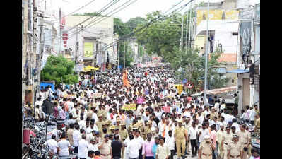 Koppal: The Koppal bandh, called by the District Valmiki Mahasabha on Monday, condemning the murder of Gavisiddappa, a youth from the Valmiki community, evoked a strong response from the public. Most traders voluntarily shut their shops, and a large protest march was taken from the Clock Tower to Ashoka Circle. During the protest, Raghavendra Hitnal, the ruling Congress MLA from Koppal, took part in the march, wearing a saffron shawl. He demanded punishment for those responsible for Gavisiddappa’s murder. In light of the massive protest, the police department implemented tight security measures. BJP state secretary Sharan Thallikeri called for the murder case to be handed over to the NIA. CV Chandrashekhar urged the CM and deputy CM to visit the family of deceased and offer condolences. Former MLA Raju Gowda emphasised the need to prevent such incidents in the future, condemning the murder as a planned act and demanding punishment for all culprits involved. Gavisiddappa’s father Ningajja demanded capital punishment for the accused and thanked everyone for their support. BJP functionaries like Basavaraj Dadesguru, Dr Basavaraj Kyawatar, former MLA Paranna Munavalli, and others led the protest rally.