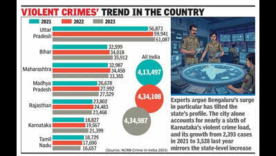 Bengaluru: Karnataka reported more than 21,000 violent crimes in 2023, placing it sixth among Indian states, according to the Crime in India 2023 report released by the National Crime Records Bureau (NCRB).This puts it behind Uttar Pradesh, Bihar, Maharashtra, Madhya Pradesh and Rajasthan, but ahead of southern neighbour Tamil Nadu, which has steadily reduced its violent crime load over the past three years.Murder, rape, kidnapping and abduction, attempt to murder, robbery, dacoity, arson and rioting are grouped by the NCRB under “violent crimes”, often used as a marker of safety at the state level. Violent crimes in the NCRB’s definition include murder, rape, kidnapping and abduction, attempt to murder, robbery, dacoity, arson and rioting — offences often treated as the barometer of public safety. The national picture shows that violent crime in India has largely plateaued.The country recorded more than 4.1 lakh cases in 2021, rising to more than 4.3 lakh in 2022, and then holding almost unchanged at 4.3 lakh again in 2023. Karnataka’s numbers, however, tell a different story.In 2021, the state logged just under 19,000 violent crimes. The following year, the number edged up to 19,567. By 2023, it had crossed 21,000—a 14% increase in three years, well above the national trend.Police officials attribute much of this to rising registration in urban centres such as Bengaluru, Mysuru and Hubballi-Dharwad, where the rollout of online complaint systems and greater awareness among citizens has led to more cases being formally booked.Uttar Pradesh remains the clear outlier nationally. Its tally of violent crimes climbed from nearly 57,000 in 2021 to just over 61,000 in 2023, meaning that one in every seven such cases in India occurs in that state.Bihar, too, has shown a steady upward trajectory, from 32,600 cases in 2021 to close to 36,000 by 2023. Maharashtra has fluctuated but stayed consistently high, reporting almost 33,400 violent crimes last year. Madhya Pradesh and Rajasthan remain close to each other, each contributing between 23,000 and 28,000 cases over the same period.Tamil Nadu offers the sharpest contrast. It reported close to 18,700 violent crimes in 2021, but the number has since dropped year on year, reaching just 16,657 in 2023. This is nearly 2,100 fewer cases than three years ago, placing the state well below Karnataka despite having a comparable population size.For Karnataka, the trend is unmistakable: while it is nowhere near the scale of Uttar Pradesh or Bihar, its violent crime numbers are climbing steadily. Experts argue that Bengaluru’s surge in particular has tilted the state’s profile. The city alone accounts for nearly a sixth of Karnataka’s violent crime load, and its growth from 2,393 cases in 2021 to 3,528 last year mirrors the state-level increase.The NCRB cautions that higher numbers can partly reflect improved reporting, not just deteriorating safety. Still, the trajectory places Karnataka in a bracket of states whose violent crime burden is inching upwards even as the national curve has flattened.——Graphic: Violent crimes trend (2021–2023)■ Uttar Pradesh: 56,873 → 59,941 → 61,087■ Bihar: 32,599 → 34,018 → 35,912■ Maharashtra: 32,987 → 34,458 → 33,365■ Madhya Pradesh: 26,678 → 27,992 → 27,529■ Rajasthan: 23,802 → 24,483 → 23,468■ Karnataka: 18,827 → 19,567 → 21,399■ Tamil Nadu: 18,729 → 17,690 → 16,657■ All India: 4,13,497 → 4,34,108 → 4,34,987(Source: NCRB Crime in India 2023)