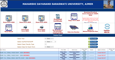 Maharshi Dayanand Saraswati University (MDSU), Ajmer, has released the admit cards for previous and final year examinations for several undergraduate and postgraduate courses. These include programmes such as MA Indian Music, MA Drawing & Painting, along with other UG and PG exams. Students appearing for these examinations can now download their admit cards from the university’s official examination website, mdsuexam.org.The admit cards have been issued online only, and no physical copies will be sent to students. Candidates must carry a printed copy of the hall ticket to the examination centre.