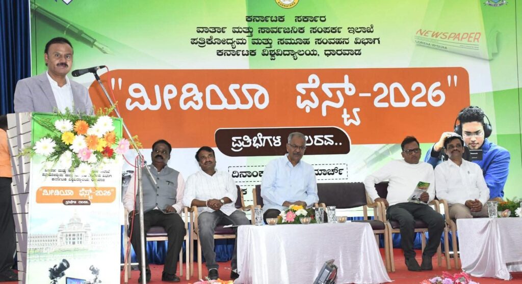 ಅವರು ಇಂದು (ಮಾ.09) ಬೆಳಿಗ್ಗೆ ಕರ್ನಾಟಕ ವಿಶ್ವವಿದ್ಯಾಲಯದ ಕನಕ ಅಧ್ಯಯನ ಪೀಠದ ಸಭಾಂಗಣದಲ್ಲಿ ವಾರ್ತಾ ಮತ್ತು ಸಾರ್ವಜನಿಕ ಸಂಪರ್ಕ ಇಲಾಖೆಯು ಕರ್ನಾಟಕ ವಿಶ್ವವಿದ್ಯಾಲಯದ ಪತ್ರಿಕೋದ್ಯಮ ಮತ್ತು ಸಮೂಹ ಸಂವಹನ ವಿಭಾಗದ ಆಶಯದಲ್ಲಿ ಆಯೋಜಿಸಿರುವ ಮೀಡಿಯಾ ಫೆಸ್ಟ್-2026 ರ ಸ್ಪರ್ಧೆಗಳನ್ನು ಸಸಿಗೆ ನೀರುಣಿಸುವ ಮೂಲಕ ಉದ್ಘಾಟಿಸಿ ಮಾತನಾಡಿದರು.