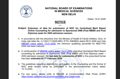 NBEMS has stated that no changes have been made either to the eligibility requirements or to the NOC format. All the instructions concerning the counselling participation will still be as per the 10th December, 2025 notice.Candidates must strictly adhere to the given format and submit it on time to prevent their disqualification from the counselling process.Aspirants can click on the notice as provided here to download the official notice related to the extension of the Candidates applying for Sponsored DNB (Post MBBS and Post Diploma) seats must ensure that the No Objection Certificate is issued by the competent authority and submitted within the revised deadline. The NOC is an essential document that the candidate must submit to participate in the centralized merit-based online counselling process. NBEMS has advised candidates to meticulously check their eligibility and follow the prescribed format strictly. Non-compliance or delay in submission might result in the rejection of the candidature.The applicants should keep a copy of all the documents submitted. It is also advisable to keep a check on the official NBEMS website to get the latest updates.