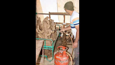 Pic: An idol maker in the city uses gas burners to dry idols following rainsHubballi: Many artisans who are busy making Ganesha idols in the twin cities, are finding it difficult to meet the demands of customers placing orders for Ganesh Chaturthi, due to heavy rains. Moderate to heavy rain have been lashing for the past two months. As the festival is approaching, many are toiling hard to deliver on time. However, the rain has become and hurdle in the idol drying process, said the idol makers.The artisans, who are supposed to be busy giving final touches to idols, are still busy drying the clay idols. The humidity in the air keeps the idols moist, hence delaying the painting process. Many fear that if the idols don’t dry on time, idols can’t be painted and also cannot decorate the idols. Some artisans have even cancelled some orders following heavy rains.“Ban on POP idols have increased the demand for clay idols, but heavy rain is hampering the idol making process. I have stopped taking fresh orders due to the rain. It has become difficult to dry idols and give final touches. We are using a heater to dry the idols,” said Vijayakumar Kamble, an artisan in Bammapur street.Nabkumar Chitraghar from West Bengal, who is making idols in Ganeshpet, said, “We are now using a gas burner to dry the idols so we can paint and decorate them. We have to deliver 45 idols which are to be installed in public places. We are working 14 to 16 hours daily to meet the expectations. We have erected a big pandal and tin shed to protect idols from the rain,” he said.Eco-friendly idol maker Manjunath Hiremath of Kelgeri said, “It is really a big challenge for artisans to make idols in the rains. We fix the idol’s price before taking orders, and are using artificial techniques like charcoal ovens, heaters, pedestal fans, blowtorches, or gas burners to dry the idols, which is increasing the production cost. Now, we need to find other ways to make idols facing climate challenges,” he added.Satish Murghod, another artist, said, “I had to cancel some orders following the rain, and I am using a heater in the morning and evening to dry the idols.” Many other artists said, “If we used heaters or burners to dry the idols, there are chances that it might crack, so we are using fans, heaters, and other methods extra cautiously,” they said.