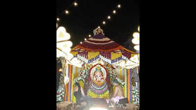 Madikeri: The historic Virajpet Ganapati idol immersion ceremony faced a temporary delay on Saturday night due to rain, which affected the procession of 22 Ganesha idols. The rain, which began around 6pm and lasted until 8pm, dampened the spirits of thousands of devotees who had gathered from various locations to witness the grand event. However, the organising committee remained undeterred to ensure the mantaps were attractively decorated, and the celebrations resumed by 9.30pm under bright, vibrant lights. The traditional procession began with a special worship at the Sri Maha Ganapati Temple, followed by the installation of the main Ganesha idol in a flower-decorated vehicle. The procession was flagged off with the bursting of crackers and the ceremonial offering of 101 coconuts.The chariot of the Sri Maha Ganapati temple idol led the procession to the Sri Basaveshwara Temple, where the remaining mantaps joined in ceremonially.Security was given top priority. ADGP (law and order) BK Singh and DIG (southern range) Boralingaiah oversaw the arrangements. More than 1,200 police personnel, including officers from neighbouring districts, were deployed to ensure safety of the public. Traffic was regulated, and a liquor ban was enforced to maintain order during the festivities. The security force included a 50-member Jumbo team, a 30-member Cheetah team, and a dedicated team of cameramen, all working to prevent any untoward incidents and ensure the celebrations went smoothly.