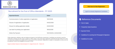 Candidates must visit the official RBI website and register for the Office Attendant 2026 post. They need to fill out the application form carefully, upload the required documents, and pay the application fee online. Fees are ₹450 for general and OBC candidates, and ₹50 for SC/ST/PwBD/Ex-Servicemen. After submission, candidates should take a printout of the confirmation page for future reference. The application window closes on February 4, 2026, and no requests will be accepted after the deadline.Direct link to apply for RBI Office Attendant.