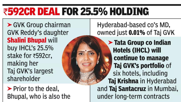 MUMBAI: GVK Group chairman GVK Reddy’s daughter Shalini Bhupal is set to buy out Indian Hotels’ 25.5% stake in Taj GVK Hotels & Resorts for Rs 592 crore, making her the company’s largest shareholder. Prior to the deal, Bhupal, who is also the MD of the Hyderabad-based hospitality player, owned just 5,000 shares or 0.01% of Taj GVK. Friday’s development increases Bhupal and GVK Reddy family’s stake in the company to about 75%, while also marking Indian Hotels’ (IHCL’s) exit from ownership. However, Tata Group company IHCL will continue to manage Taj GVK’s portfolio of six hotels, including the iconic Taj Krishna in Hyderabad and Taj Santacruz in Mumbai, under long-term contracts. Bhupal’s son and Taj GVK’s joint MD Krishna Bhupal, said the company plans to increase its inventory to 4,000 keys in the next five years from the current over 1,500 keys.