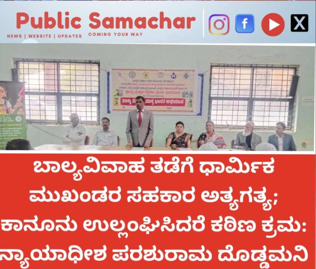 ಧಾರವಾಡ: ಬಾಲ್ಯವಿವಾಹ ಎಂಬುದು ಒಂದು ಸಾಮಾಜಿಕ ಪಿಡುಗಾಗಿದ್ದು, ಇದನ್ನು ನಿರ್ಮೂಲನೆ ಮಾಡುವಲ್ಲಿ ಧಾರ್ಮಿಕ ಮುಖಂಡರ ಪಾತ್ರ ಮಹತ್ವದ್ದಾಗಿದೆ. ವಿವಾಹ ನಿಶ್ಚಯಿಸುವ ಸಂದರ್ಭದಲ್ಲಿ ವಯಸ್ಸಿನ ಮಿತಿಯನ್ನು ಕಟ್ಟುನಿಟ್ಟಾಗಿ ಪಾಲಿಸಬೇಕು, ತಪ್ಪಿದಲ್ಲಿ ಅದರಲ್ಲಿ ಭಾಗಿಯಾಗುವ ಎಲ್ಲರ ವಿರುದ್ಧವೂ ಕಾನೂನು ಕ್ರಮ ಜರುಗಿಸಲಾಗುವುದು ಎಂದು ಹಿರಿಯ ಸಿವಿಲ್ ನ್ಯಾಯಾಧೀಶ ಹಾಗೂ ಜಿಲ್ಲಾ ಕಾನೂನು ಸೇವೆಗಳ ಪ್ರಾಧಿಕಾರದ ಸದಸ್ಯ ಕಾರ್ಯದರ್ಶಿ ಪರಶುರಾಮ ದೊಡ್ಡಮನಿ ಎಚ್ಚರಿಕೆ ನೀಡಿದರು.
