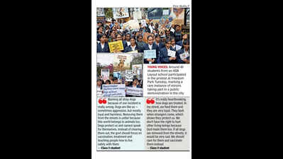 Bengaluru: Protests against the Supreme Court’s recent fiat on stray dog management took an unusual turn Tuesday when schoolchildren joined animal lovers and activists at Freedom Park, questioning the feasibility of implementing the directions in a city that lacks adequate shelter infrastructure.Around 40 students from classes 8 and 9 of Lawrence High School in HSR Layout participated in the protest, marking a rare instance of minors taking part in a public demonstration in the city.The protesters argued that relocating or confining stray dogs without functional shelters would be impractical and inhumane, causing distress to animals and disrupting their coexistence with humans. They stressed that the city’s civic administration is not equipped to handle large-scale removal of street dogs at present.School authorities said the students attended voluntarily and with parental consent. “They wanted to express their views after observing developments around them. No one forced them to participate,” a teacher said.At the protest, organised by South Bengaluru Cares, students spoke about their everyday interactions with strays in their neighbourhoods, describing them as a familiar and often protective presence on residential streets. Several children questioned why dogs were being blamed collectively for isolated bite incidents, arguing that aggression is often the result of fear, neglect, or mistreatment.One student said removing dogs from their streets was like “separating friends”, referring to residents who regularly feed and care for strays. Another one noted that barking is a natural response to protect territory and people, and that animals cannot explain themselves when frightened or provoked.The protesters urged Greater Bengaluru Authority (GBA) to follow the Supreme Court’s emphasis on humane handling, particularly the condition that dogs should be moved to shelters only where such facilities exist. They also called for vaccination, sterilisation, and public awareness as more sustainable solutions.