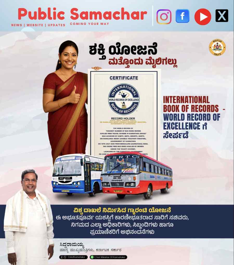 ಬೆಂಗಳೂರು: ರಾಜ್ಯ ಸರ್ಕಾರದ ಮಹತ್ವಾಕಾಂಕ್ಷೆಯ ಗ್ಯಾರಂಟಿ ಯೋಜನೆಗಳಲ್ಲಿ ಒಂದಾದ ‘ಶಕ್ತಿ’ ಯೋಜನೆ ಇದೀಗ International Book of Records – World Record of Excellence ಗೆ ಸೇರ್ಪಡೆಗೊಂಡು ಮತ್ತೊಂದು ಮೈಲಿಗಲ್ಲು ಸಾಧಿಸಿದೆ. ಇದು ಸಮಸ್ತ ಕನ್ನಡಿಗರು ಹೆಮ್ಮೆ ಪಡುವ ಕ್ಷಣ ಎಂದು ಮುಖ್ಯಮಂತ್ರಿ ಸಿದ್ದರಾಮಯ್ಯ ಅವರು ಹೇಳಿದ್ದಾರೆ.