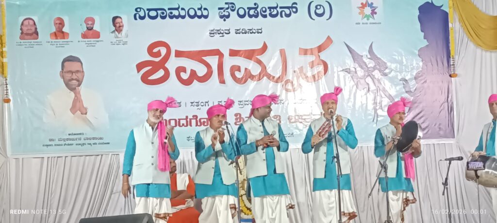 ಕುಂದಗೋಳ: ಪಟ್ಟಣದ ಶ್ರೀ ಶಂಭುಲಿಂಗೇಶ್ವರ ದೇವಸ್ಥಾನದ ಆವರಣದಲ್ಲಿ ಮಹಾಶಿವರಾತ್ರಿ ಪ್ರಯುಕ್ತ ನಿರಾಮಯ ಫೌಂಡೇಶನ್ ಹಮ್ಮಿಕೊಂಡಿದ್ದ ಸಂಗೀತ, ನೃತ್ಯ ಹಾಗೂ ಜಾನಪದ ಒಳಗೊಂಡ ‘ಶಿವಾಮೃತ’ ಕಾರ್ಯಕ್ರಮವು ಜನಮನ ಸೂರೆಗೊಂಡಿತು. ಭಾನುವಾರ ಸಂಜೆ 7 ಗಂಟೆಗೆ ಆರಂಭವಾದ ಈ ಸಾಂಸ್ಕೃತಿಕ ಹಾಗೂ ಆಧ್ಯಾತ್ಮಿಕ ಉತ್ಸವವು ಸೋಮವಾರ ಬೆಳಗಿನ ಜಾವ 7 ಗಂಟೆಯವರೆಗೆ ನಿರಂತರವಾಗಿ ಜರುಗುವ ಮೂಲಕ ಭಕ್ತರನ್ನು ಭಕ್ತಿಭಾವದಲ್ಲಿ ತೇಲಿಸಿತು.
