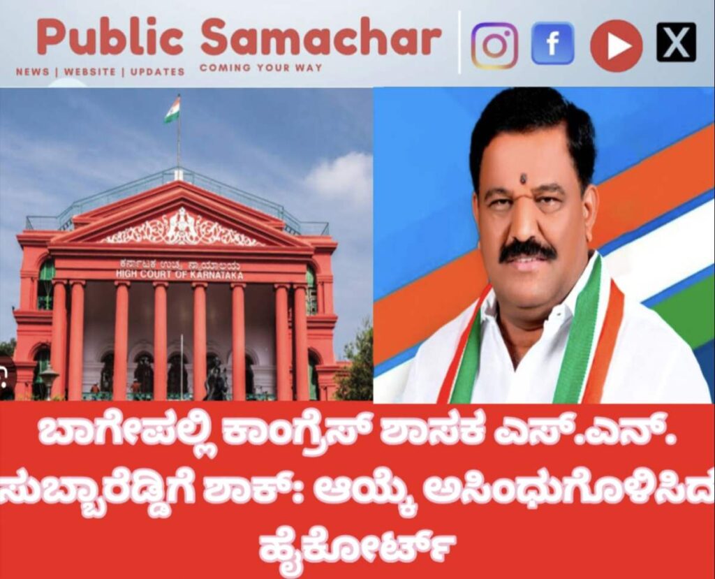 ಬೆಂಗಳೂರು: ಆಸ್ತಿ ವಿವರಗಳನ್ನು ಮರೆಮಾಚಿದ ಆರೋಪದ ಹಿನ್ನೆಲೆಯಲ್ಲಿ ಬಾಗೇಪಲ್ಲಿ ವಿಧಾನಸಭಾ ಕ್ಷೇತ್ರದ ಕಾಂಗ್ರೆಸ್ ಶಾಸಕ ಎಸ್.ಎನ್. ಸುಬ್ಬಾರೆಡ್ಡಿ ಅವರ ಆಯ್ಕೆಯನ್ನು ಕರ್ನಾಟಕ ಹೈಕೋರ್ಟ್ ಅಸಿಂಧುಗೊಳಿಸಿ ಮಹತ್ವದ ಆದೇಶ ಹೊರಡಿಸಿದೆ. ಈ ತೀರ್ಪಿನಿಂದಾಗಿ ರಾಜ್ಯ ರಾಜಕಾರಣದಲ್ಲಿ ಸಂಚಲನ ಮೂಡಿದ್ದು, ಶಾಸಕ ಸ್ಥಾನಕ್ಕೆ ಸಂಚಕಾರ ಬಂದಿದೆ.