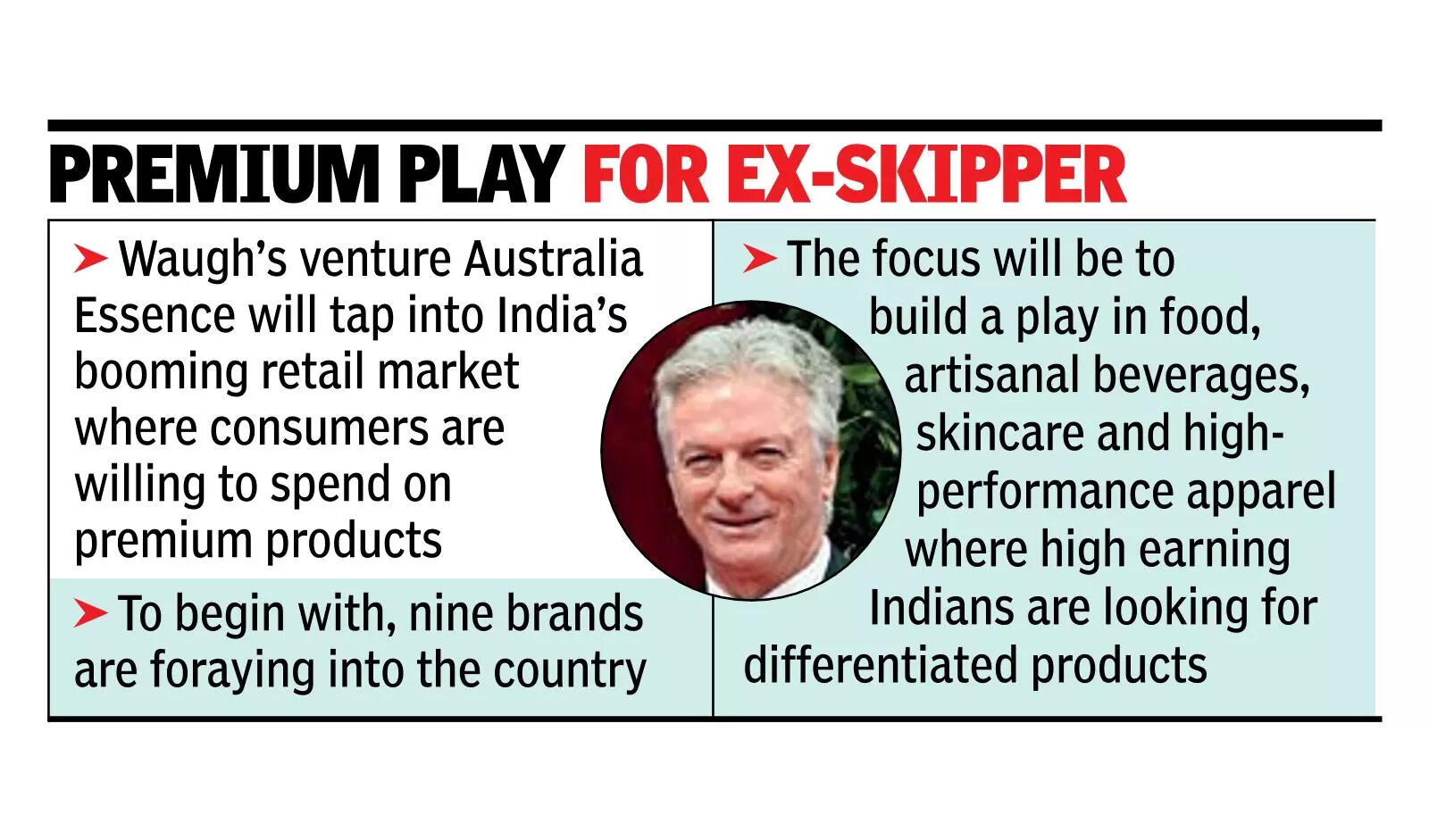 MUMBAI: At 60, when few people gather the courage to try something new, Steve Waugh is undertaking an entrepreneurial stint in India.The former Australian captain who enthralled fans with his gritty batting is launching Australia Essence, a business venture he co-founded, here to tap into the country’s booming retail market where consumers are increasingly seeking better choices and willing to spend on premium products.“I have always had that entrepreneurial spirit. I love doing deals, being involved with something new, it takes me out of my comfort zone. I love the challenge of being successful,” Waugh told TOI.Waugh’s ties with India, a place he calls his “second home” goes beyond cricket. Deeply influenced by Mother Teresa, he has been actively involved in steering philanthropic endeavours in the country though his foundation. Since 1998, Waugh has supported Udayan, a home for children whose families are affected by leprosy and helped raise funds for Nivedita Bhavan, the girls’ wing of the facility. Entrepreneurship is not new to Waugh-he has been invested in the Australian business landscape including investments in startups. In India, where the number of startups is growing, Waugh said he will not shy away from backing companies as long as the offer is attractive and the company is interesting.Australia Essence is building a house of brands platform-the strategy is to onboard varied premium consumer brands from Australia and launch them in India which the company said is riding on a “premiumisation wave.” To begin with, nine brands are foraying into the country. The focus will be to build a play in the food, artisanal beverages, skincare and high-performance apparel where high earning Indians are looking for differentiated products, spending on clean labels in food and beauty. The target consumers will be the urban middle class whose aspirations are “rising.” With digitisation making premium more accessible, the market opportunity extends well beyond metros, said Tim Thomas, CEO at Australia Essence. Waugh said that his strong partnership with India over the years will help in growing the venture in the market. “My area of expertise is contacts, networks, knowing people and putting people together,” Waugh said, adding that cricket has taught him perseverance, a trait which he will be carrying with him in the echelons of the business world. Waugh doesn’t miss the cricket field any more but he does follow the game, especially Test cricket. Rishabh Pant is his current favourite Indian cricketer and Waugh likes the way he plays. He was also full of praise for Test skipper Shubman Gill and was impressed by his performance in England. Asked about his favourites from yesteryears, Waugh said, “It’s a hard to pick one….Tendulkar, Dravid…Gavaskar.”