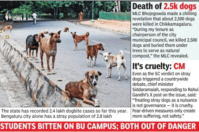 on. It is not that we are against dogs, but that should not blind us from looking at the problem,” Sharavana said.Responding to the criticism, municipal administration minister Rahim Khan expressed helplessness, given the voices of dog lovers. He reasoned that existing rules only allow for sterilising and vaccinating the stray population, and not their removal from a particular location. Angered over this response, Bhojegowda retorted: “If anyone opposes the removal of stray dogs from the streets, the govt must unleash 10 strays into the houses of each of these animal activists and let them deal with the problem.” The minister assured the House he would consult the law department and decide on filing a petition before SC.Death of 2.5k dogsMLC Bhojegowda made a chilling revelation that about 2,500 dogs were killed in Chikkamagaluru. “During my tenure as the chairperson of the City Municipality Council, we killed 2,500 dogs and buried them under trees to serve as natural compost,” the MLC revealed.CM chimes inEven as the SC verdict on stray dogs triggered a countrywide debate, chief minister Siddaramaiah, responding to Rahul Gandhi’s X post on the issue, said: “Treating stray dogs as a nuisance is not governance — it is cruelty. Fear-driven measures only create more suffering, not safety.”Students bitten on BU campusTwo walkers were bitten by stray dogs on the Bangalore University campus Tuesday.Suralkar Vikas Kishor, special commissioner (health and sanitation), BBMP, told TOI: “On Bangalore University campus, two students were bitten by dogs. They were admitted to a private hospital for treatment. Both are out of danger. We’ve sought a detailed report from the local officials.”Sharing details of the incident, Kishor said: “Apparently, there were around five dogs. The two female students were regular walkers. The dogs were also from the same area. We’re inquiring into what could have been the provocation.”