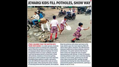 Kalaburagi: Students of Gurukula School in Jewargi town have filled the potholes in front of their school on Vijayapura Road. Jevargi AEE of the PWD department, Tajamullah Hussain, stated that a Rs 1.5 crore grant was released by KKRDB from Gurukula School to the Food Park in the town, and the contract was awarded to the Land Army. After leaving the school, instead of returning home with their parents, the students filled the potholes with stones and mud on the road, which is also the route taken by PWD officials to their offices. However, the officials have remained indifferent to these potholes, which is unfortunate. As elections approach, public representatives seeking votes with their supporters are neglecting such issues. While some appreciate the hard work and commitment of the students, others condemn the neglect by the representatives.