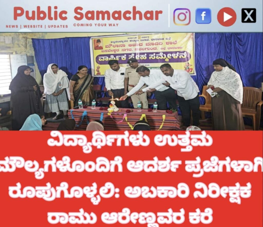 ನವಲಗುಂದ: ವಿದ್ಯಾರ್ಥಿಗಳು ಶಿಸ್ತು, ಸಂಯಮ ಮತ್ತು ಸಂಸ್ಕಾರದಂತಹ ಉತ್ತಮ ಜೀವನ ಮೌಲ್ಯಗಳನ್ನು ಮೈಗೂಡಿಸಿಕೊಳ್ಳುವ ಮೂಲಕ ಸಮಾಜದಲ್ಲಿ ಜವಾಬ್ದಾರಿಯುತ ಪ್ರಜೆಗಳಾಗಿ ಹೊರಹೊಮ್ಮಬೇಕು ಎಂದು ನವಲಗುಂದ ವಲಯದ ಅಬಕಾರಿ ನಿರೀಕ್ಷಕರಾದ ರಾಮು ಆರೇಣ್ಣವರ ಅವರು ತಿಳಿಸಿದರು. ಪಟ್ಟಣದ ಬಸವೇಶ್ವರ ನಗರದಲ್ಲಿರುವ ಮೌಲಾನಾ ಅಜಾದ್ ಮಾದರಿ ಶಾಲೆಯಲ್ಲಿ ಹಮ್ಮಿಕೊಳ್ಳಲಾಗಿದ್ದ ಶಾಲಾ ವಾರ್ಷಿಕೋತ್ಸವ ಹಾಗೂ ಸ್ನೇಹ ಸಮ್ಮೇಳನವನ್ನು ದೀಪ ಬೆಳಗಿಸಿ ಉದ್ಘಾಟಿಸಿ ಅವರು ಮಾತನಾಡಿದರು.